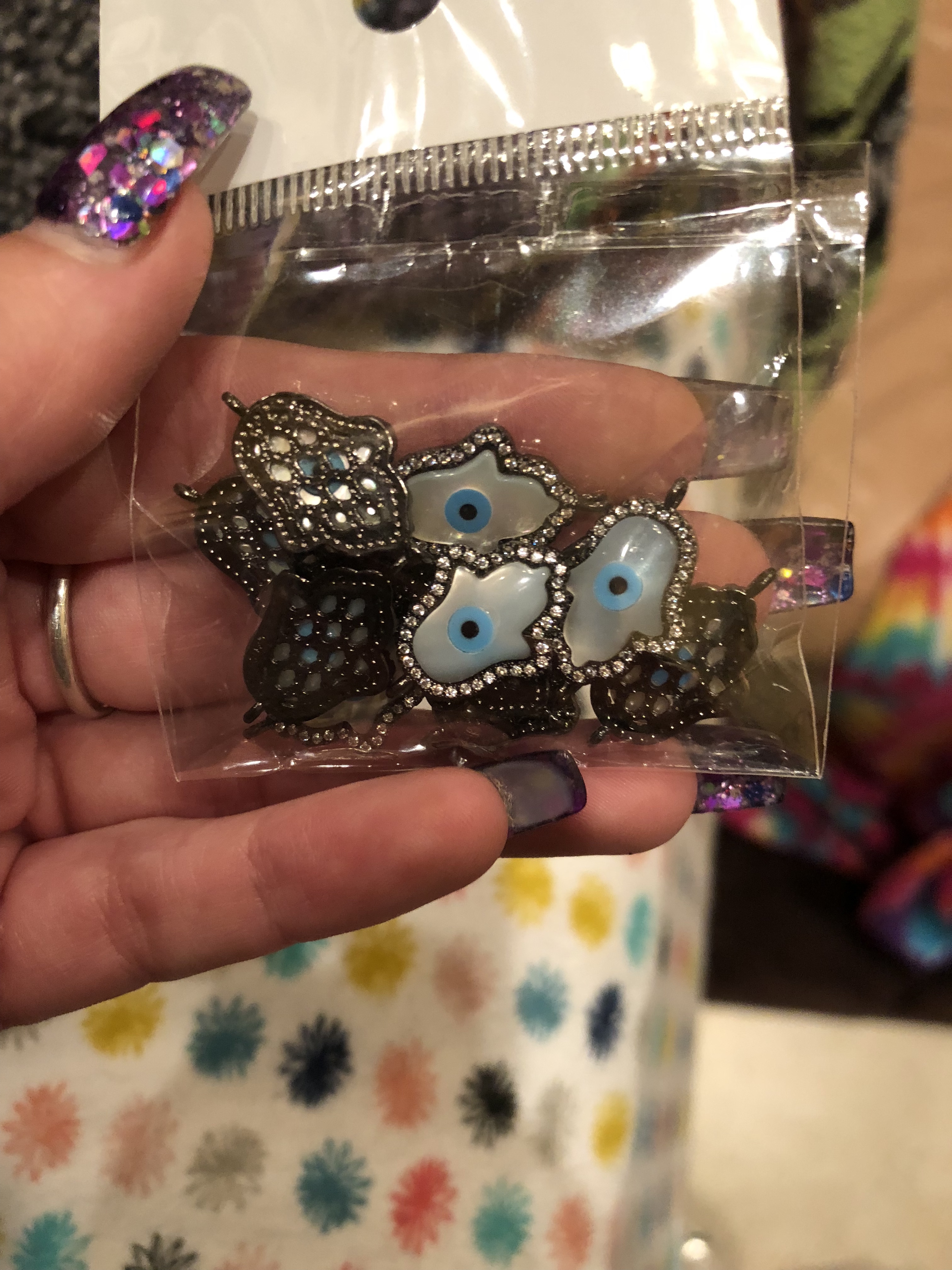 The charm that we currently have in stock is the all white mother of pearl ojo with the center being turquoise. There is an example of a beaded bracelet from a previous order, however the turquoise hams hand eye is currently not in stock.