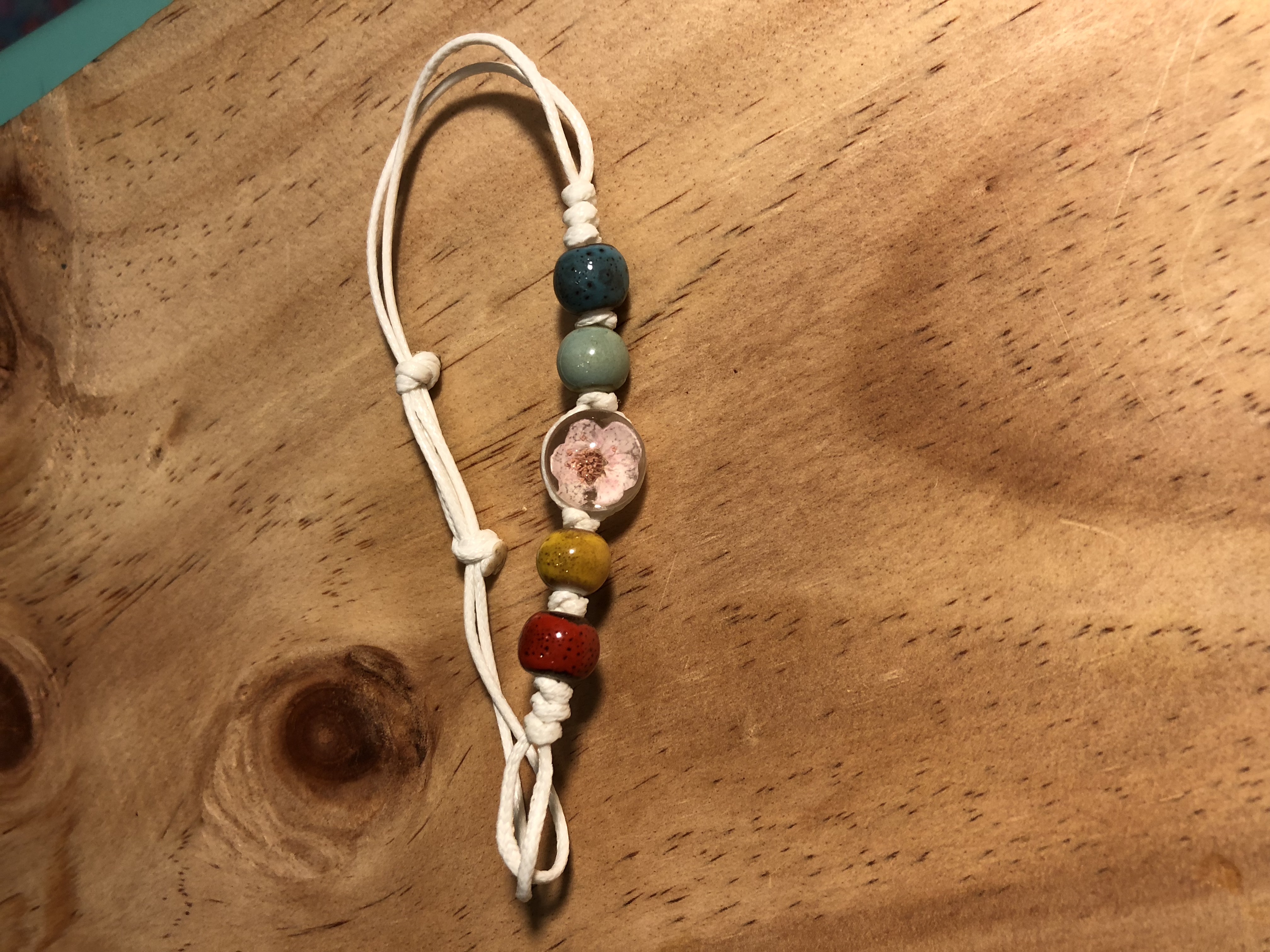 These are handmade pink flower resin beaded bracelet with ceramic beads. It is made with white adjustable leather threading. It has one medium size bead along with 4 ceramic multicolor beads.
