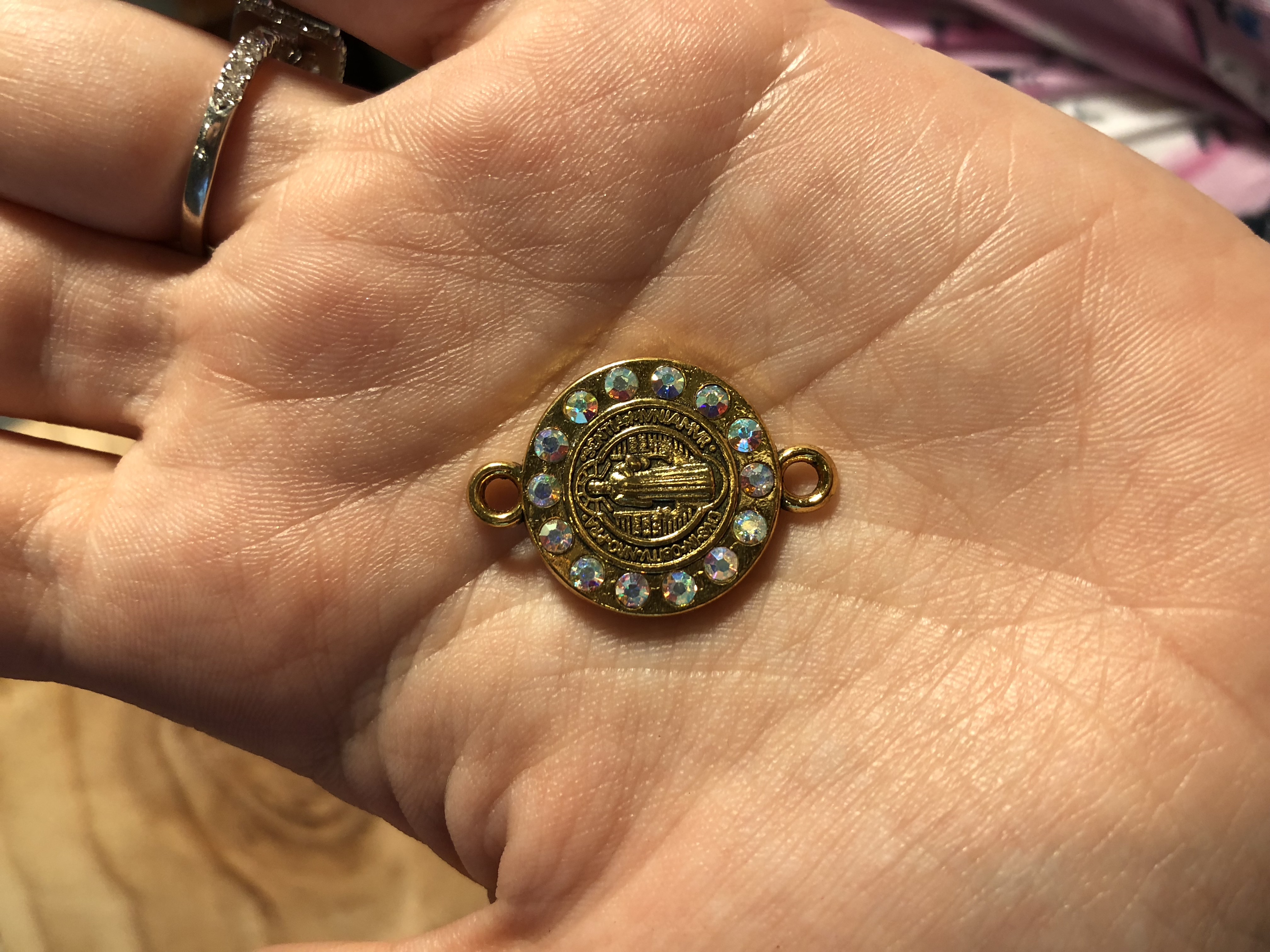 New charm- it is a gold san benito charm with iridescent rhinestones surrounding it. It can be threaded with any of our threading colors. Please make sure to include that into your comments at the end when checking out.