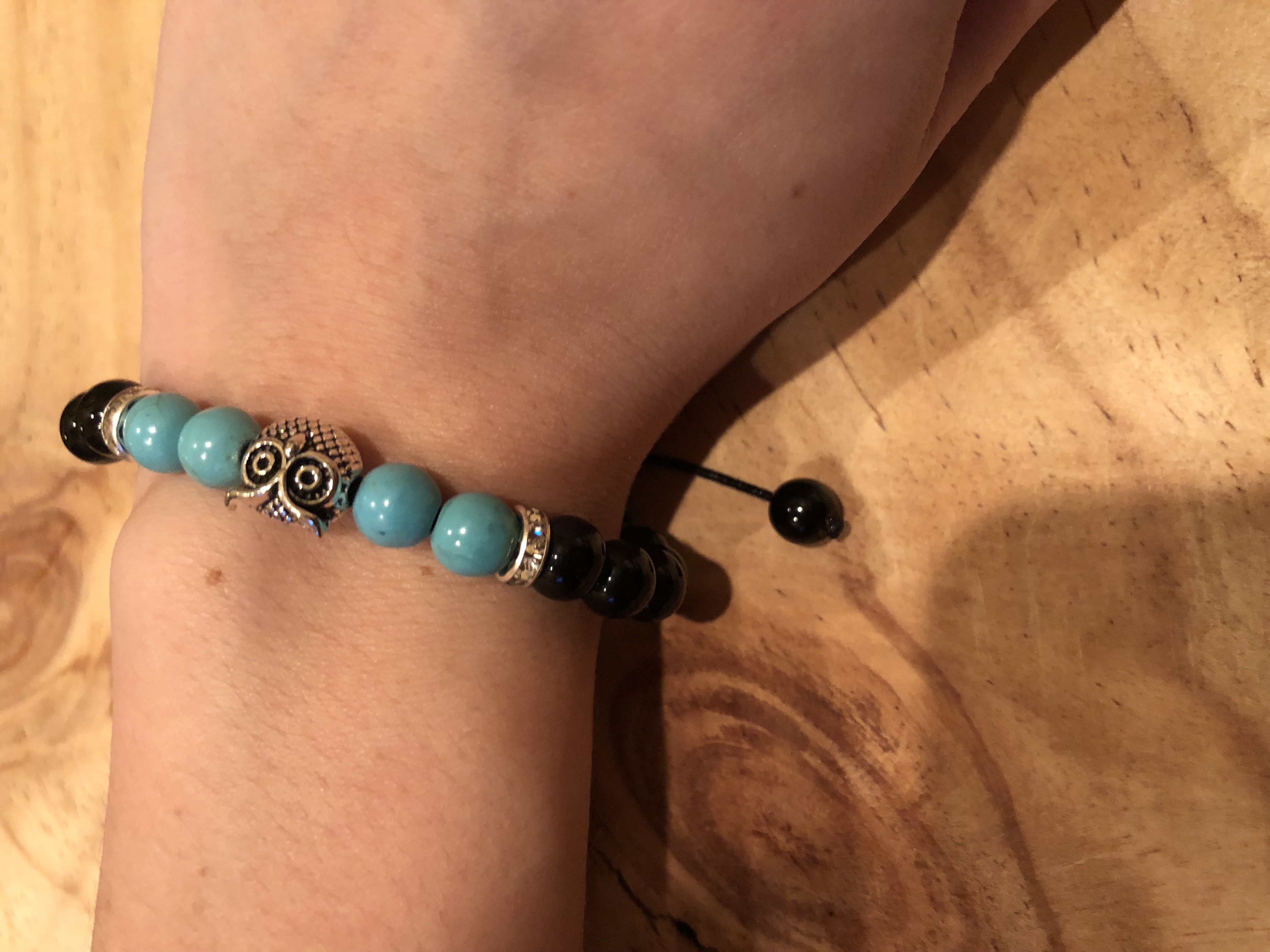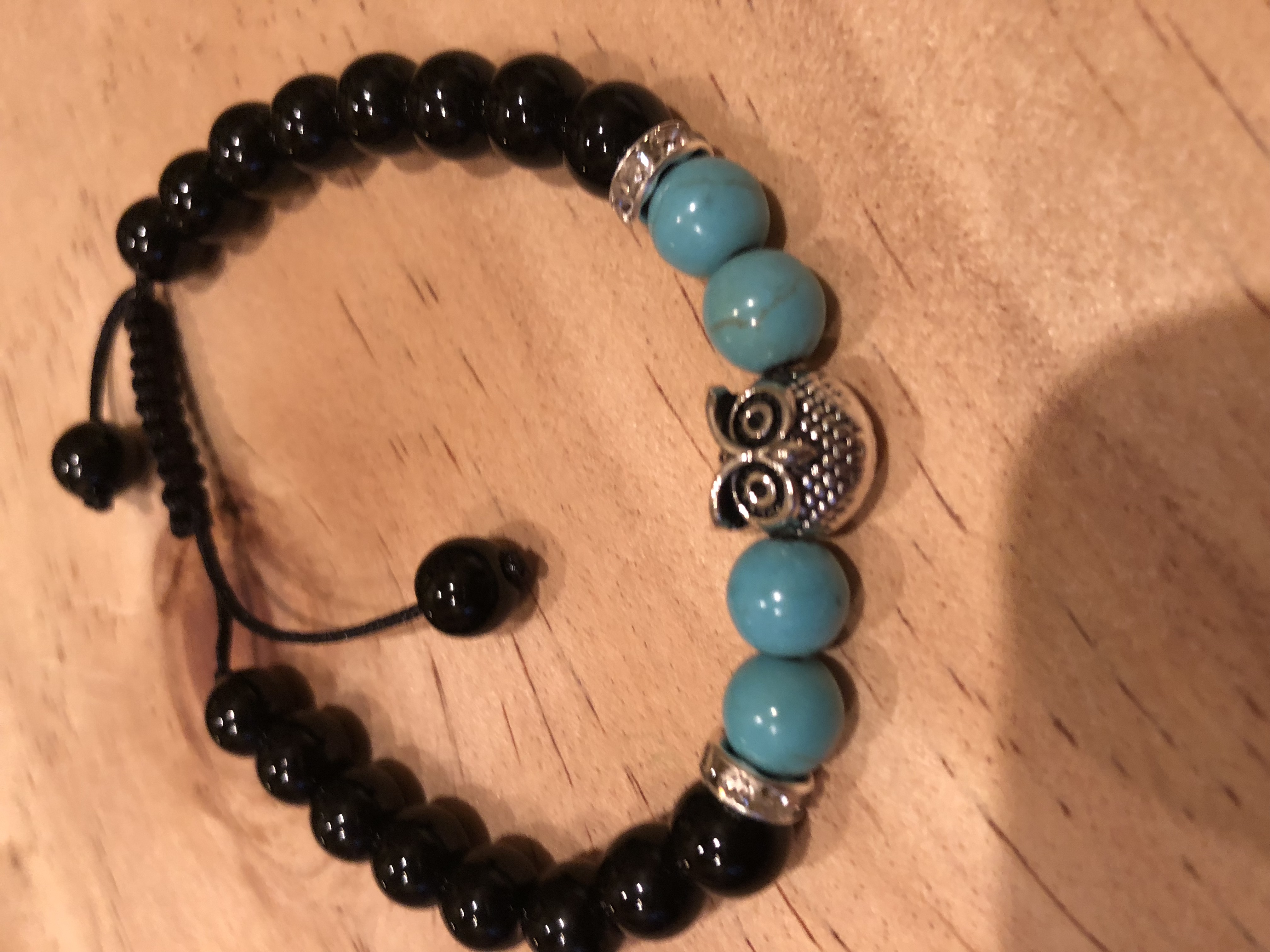 This is a turquoise bracelet that is on nylon thread. It is able to adjust on the back of the bracelet. It has a silver owl charm in the center and is surrounded with turquoise and black beads.