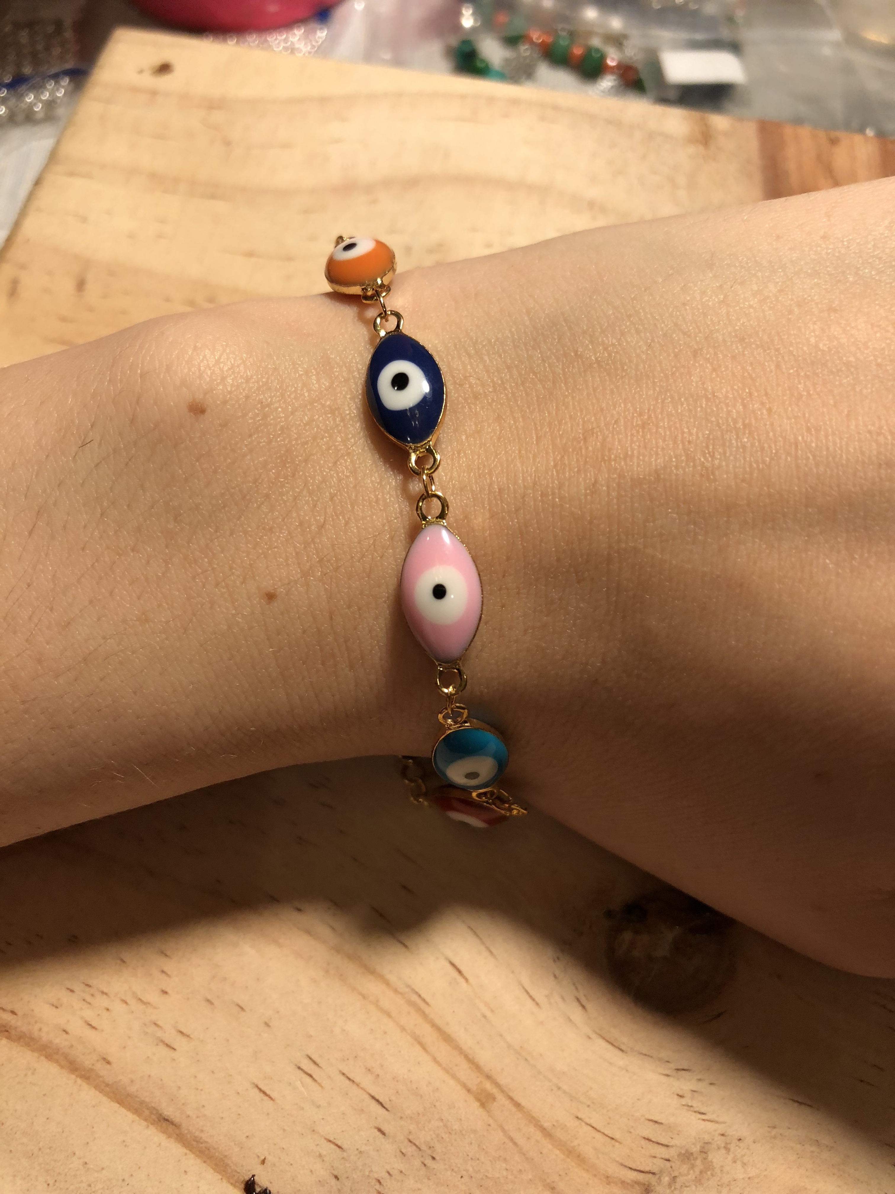 This is a handmade bracelet done by myself. It has a lobster clasp and different ring to adjust to different wrist sizes. They are made of gold so tarnishing should not occur with this product.