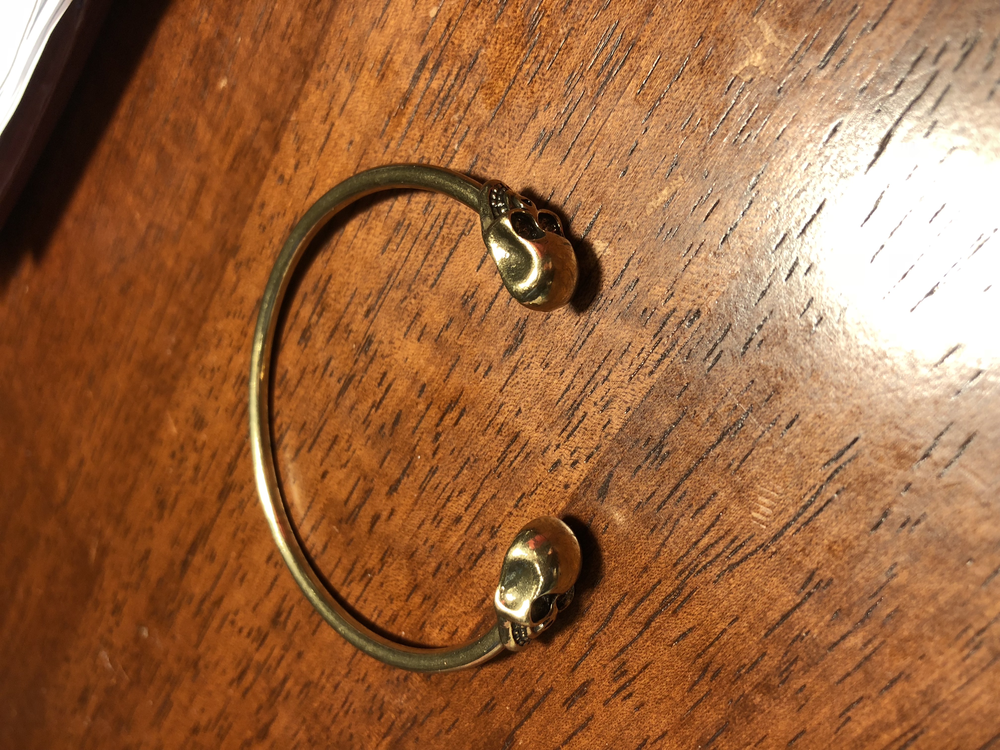 These bangles are such a unique piece. They are bronze open bangle. They have two skulls at the opening.