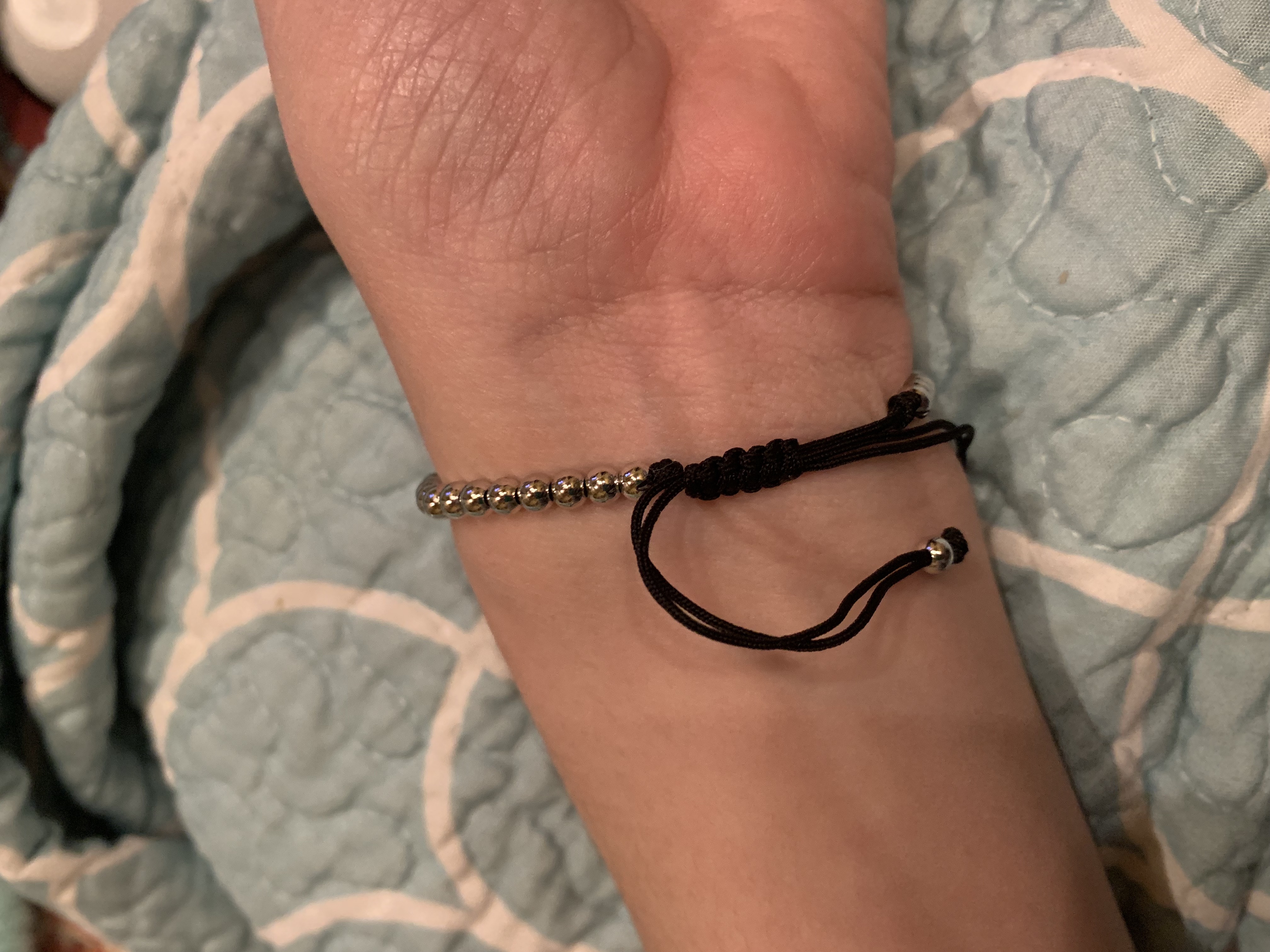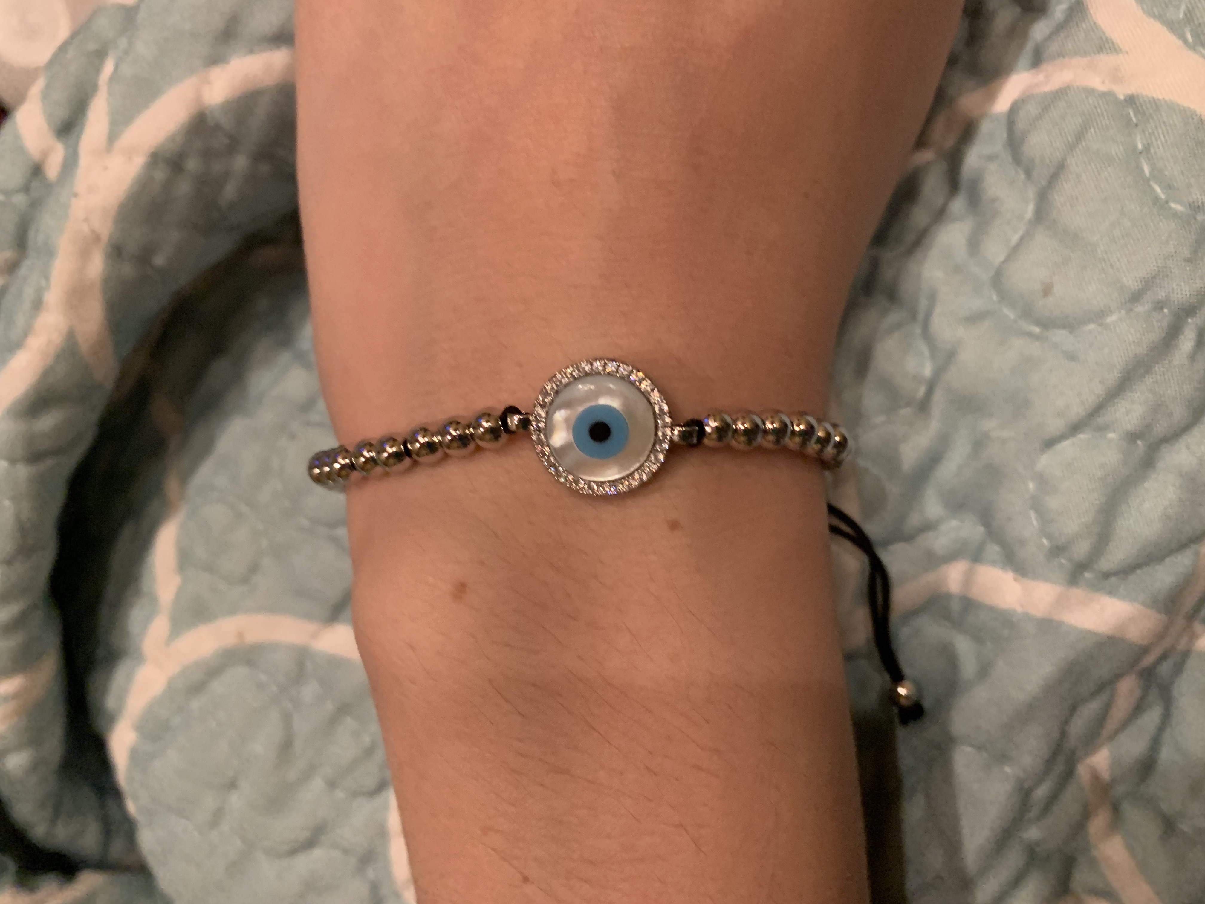 These are our circular shell ojo charm, however the band is connected with beads and is then has ab adjustable back. This style comes in various colors.