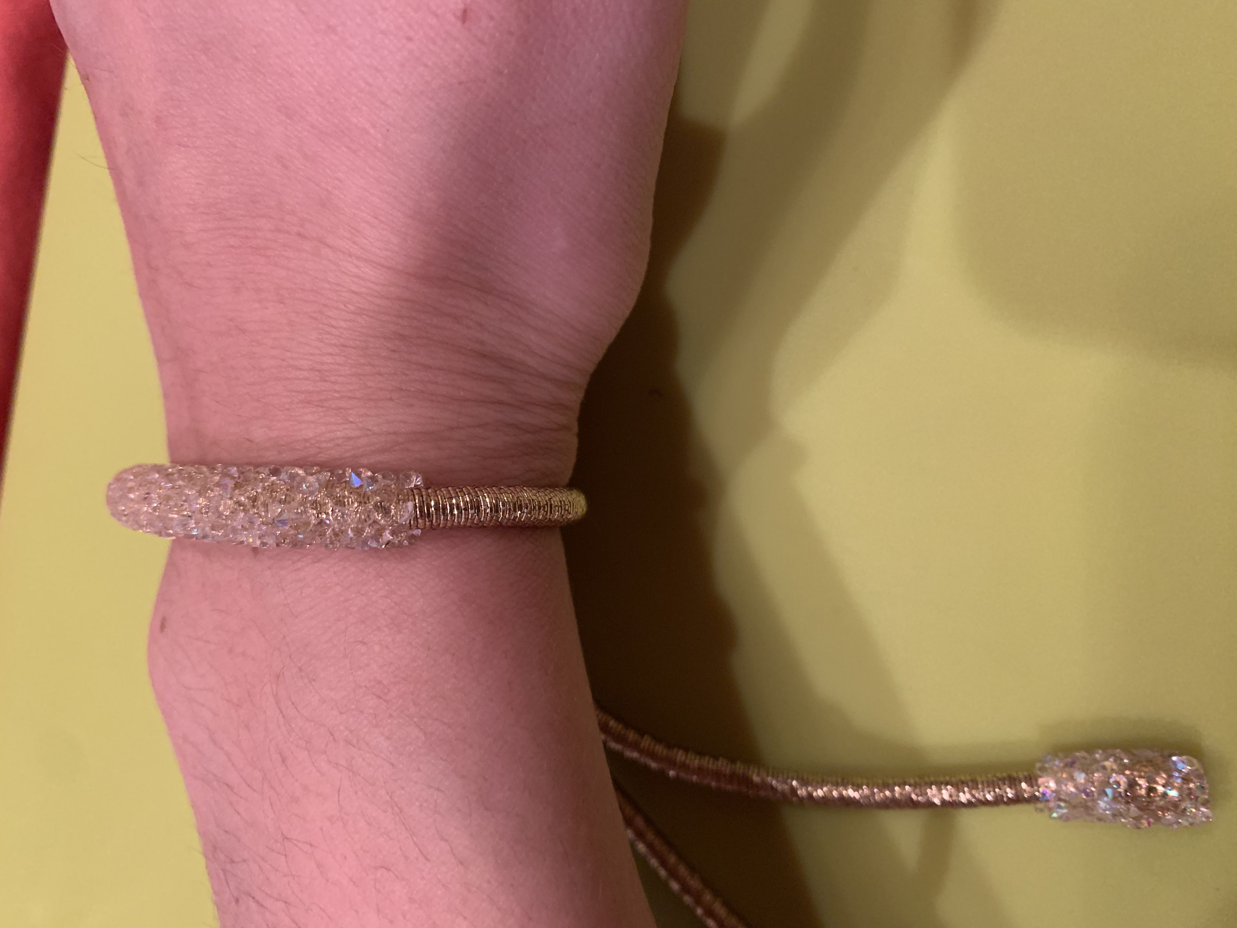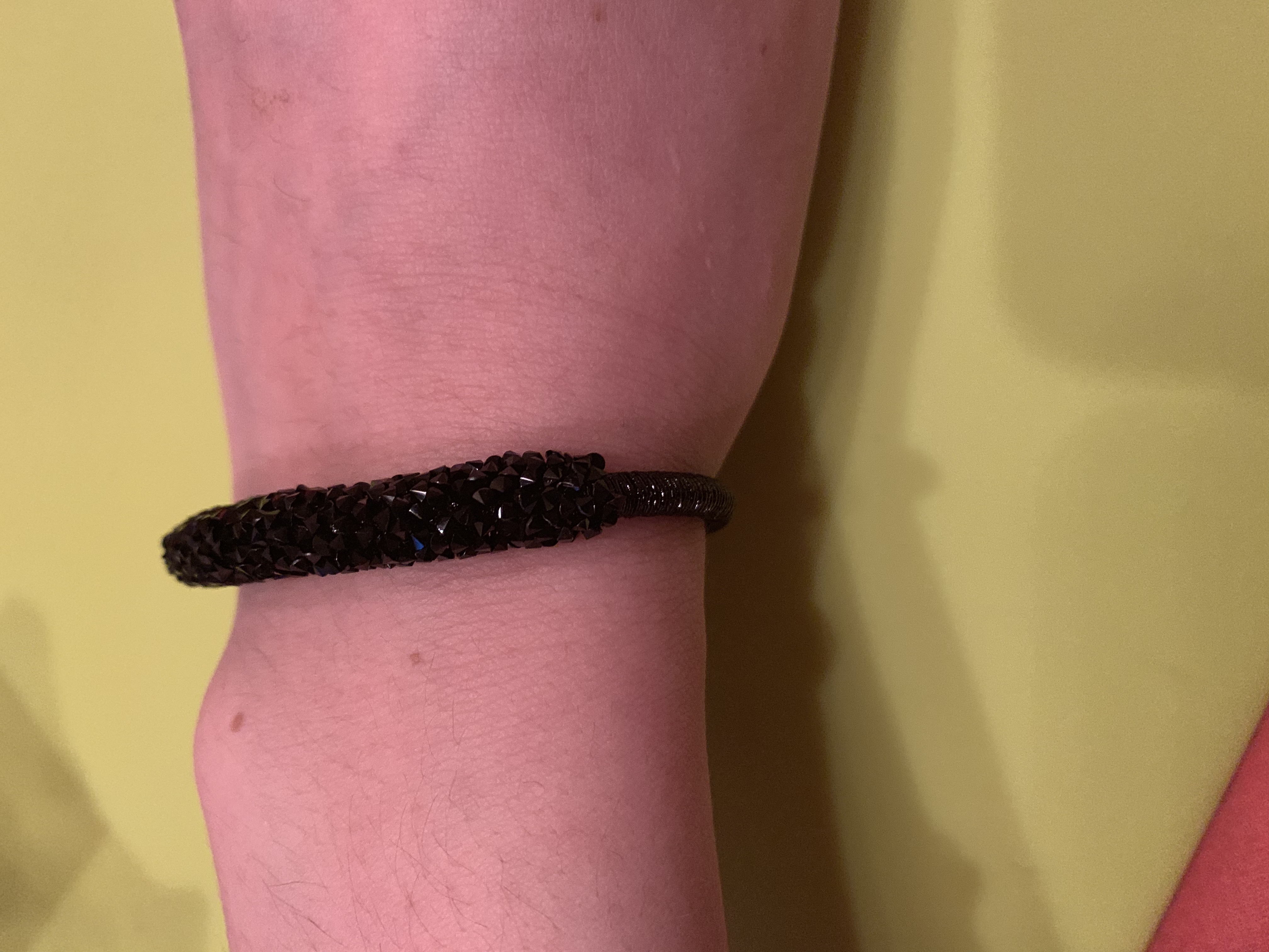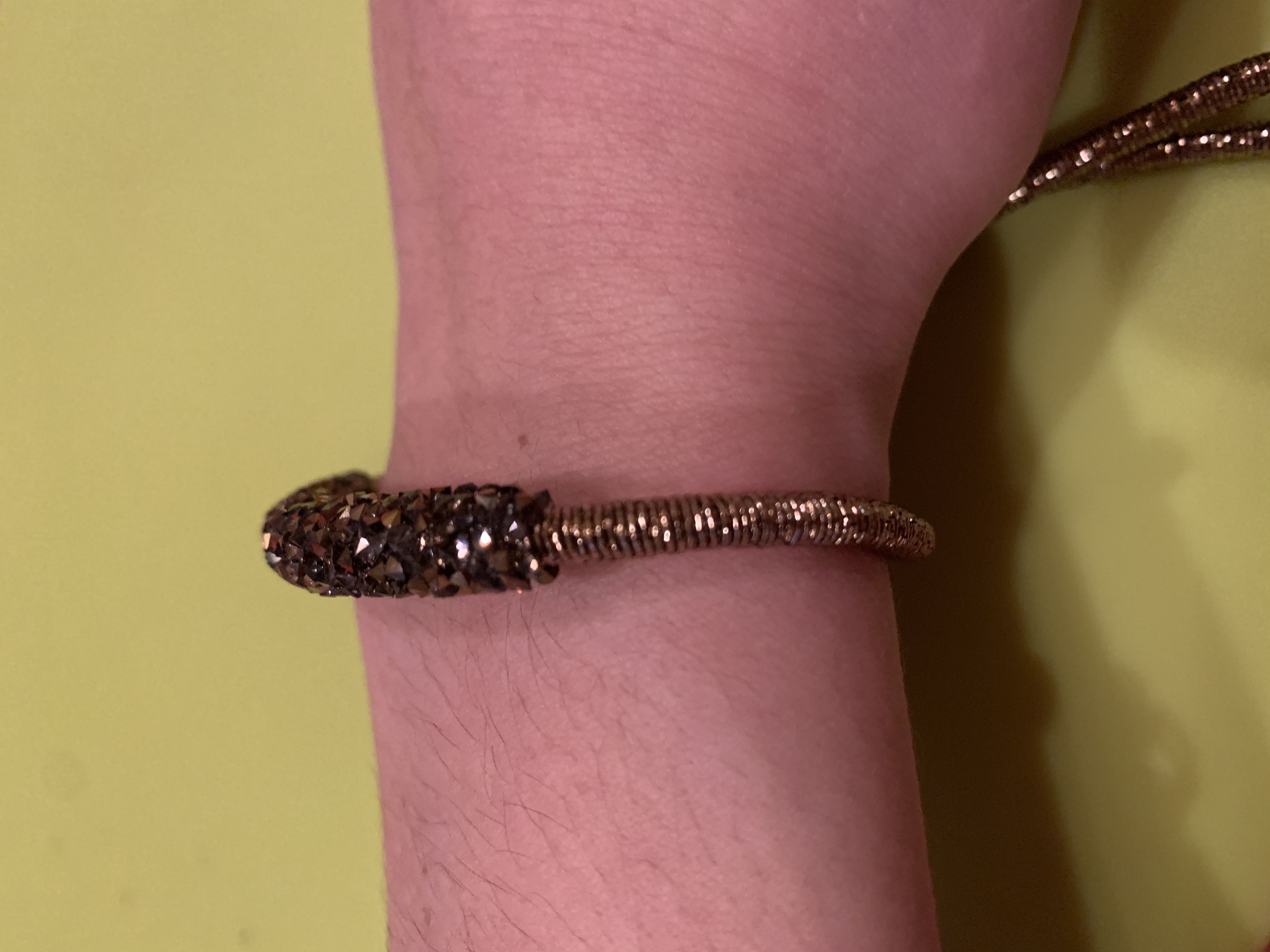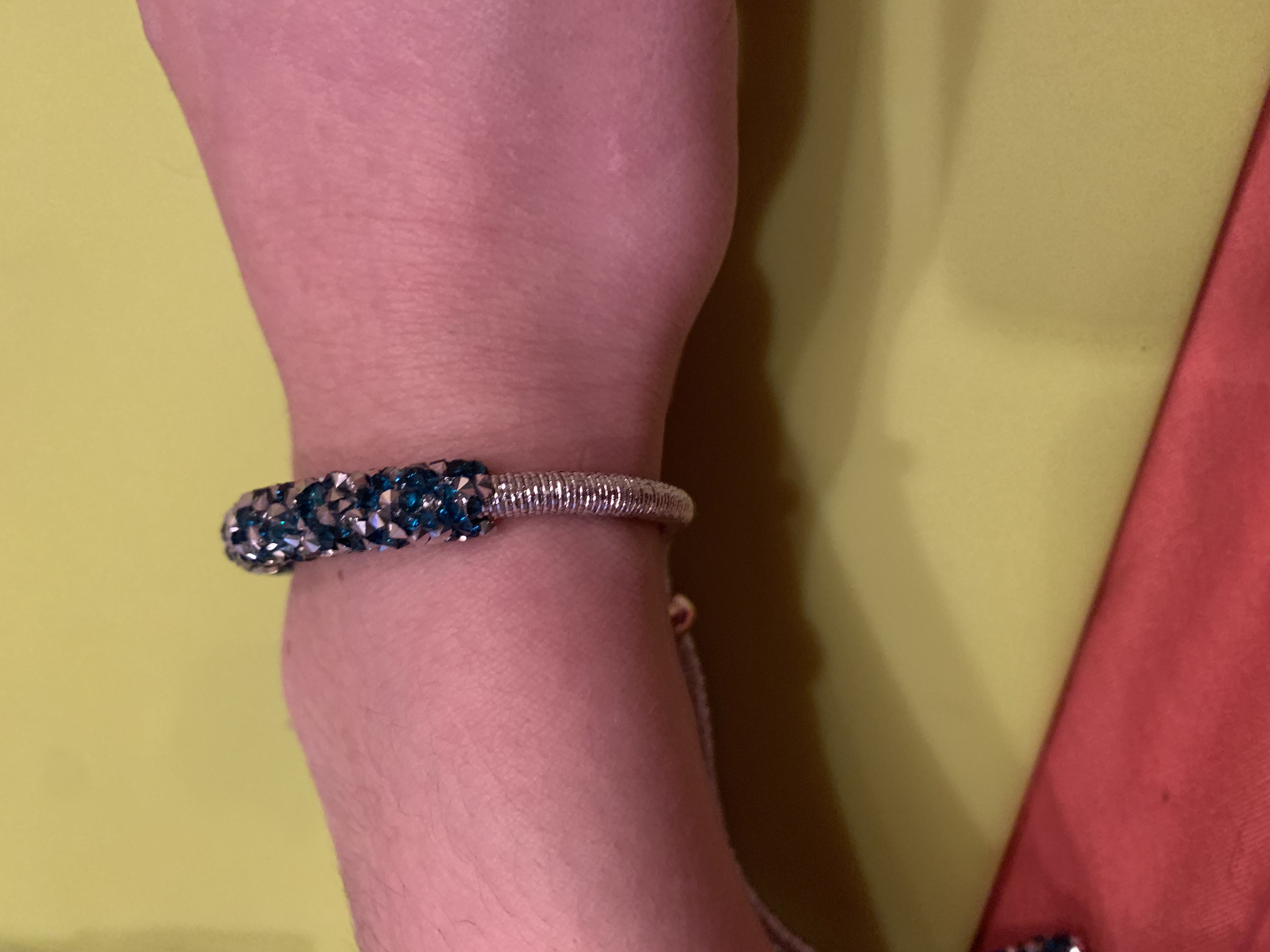 This bracelet has just the perfect amount of sparkle and is very comfortable to wear throughout the day. The center piece of the bracelet is covered in rhinestones, in addition to the tips of the bracelet. This bracelet comes in various colors.