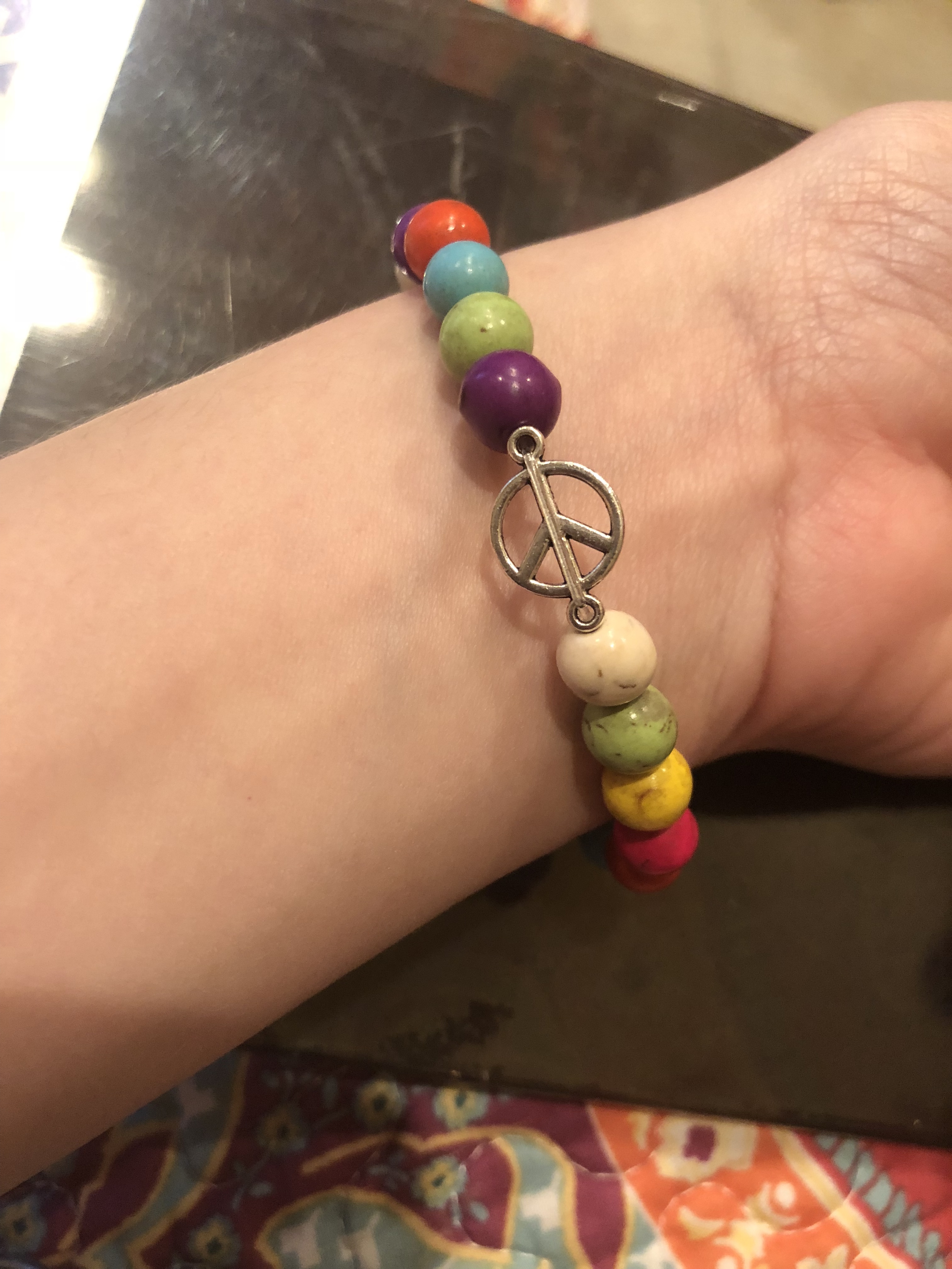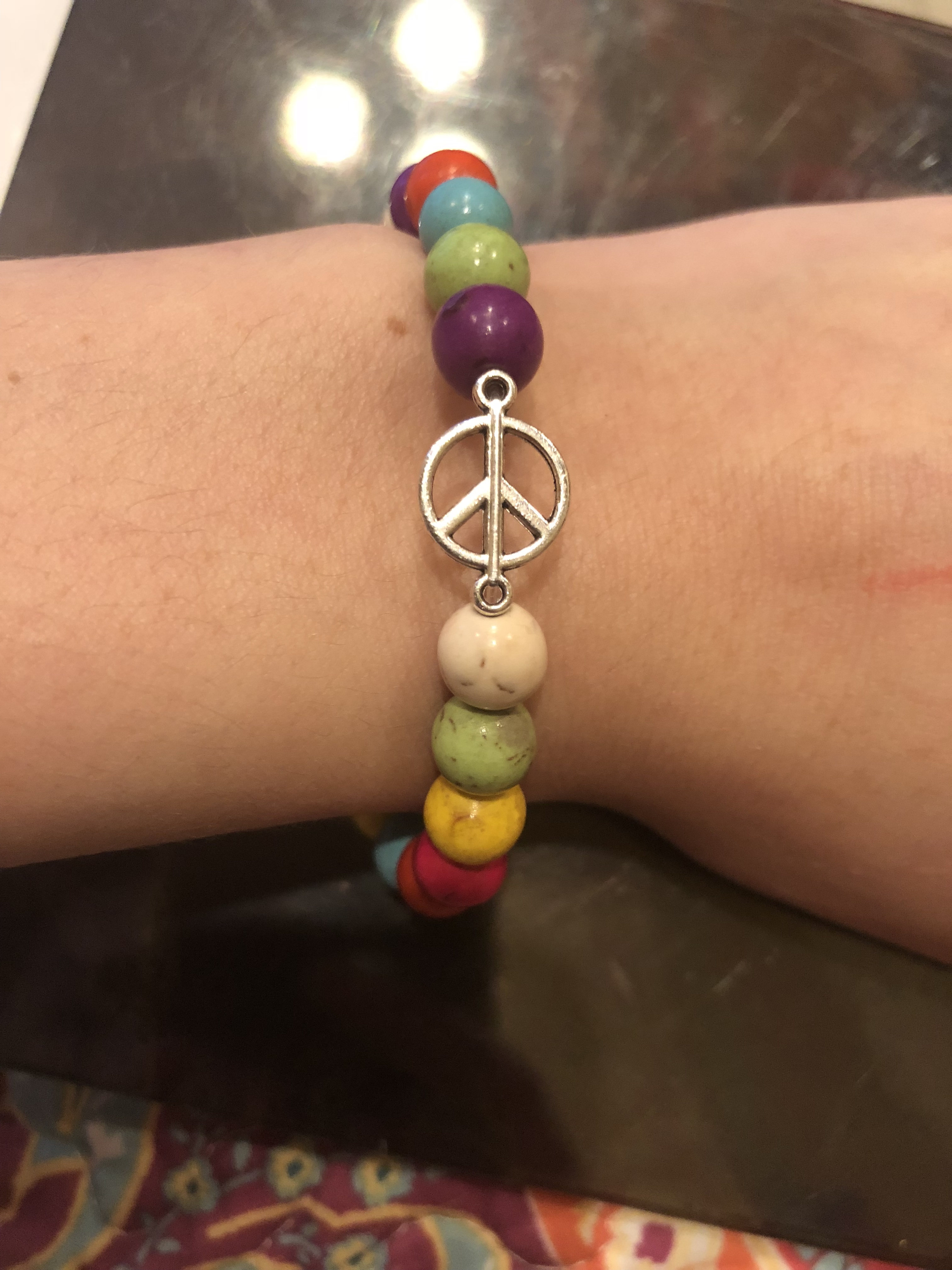 This is a handmade bracelet done by myself. In the center is a silver peace sign with multi colored beads surrounding it. It would be a great addition to anyone's jewelry pieces or as a gift.