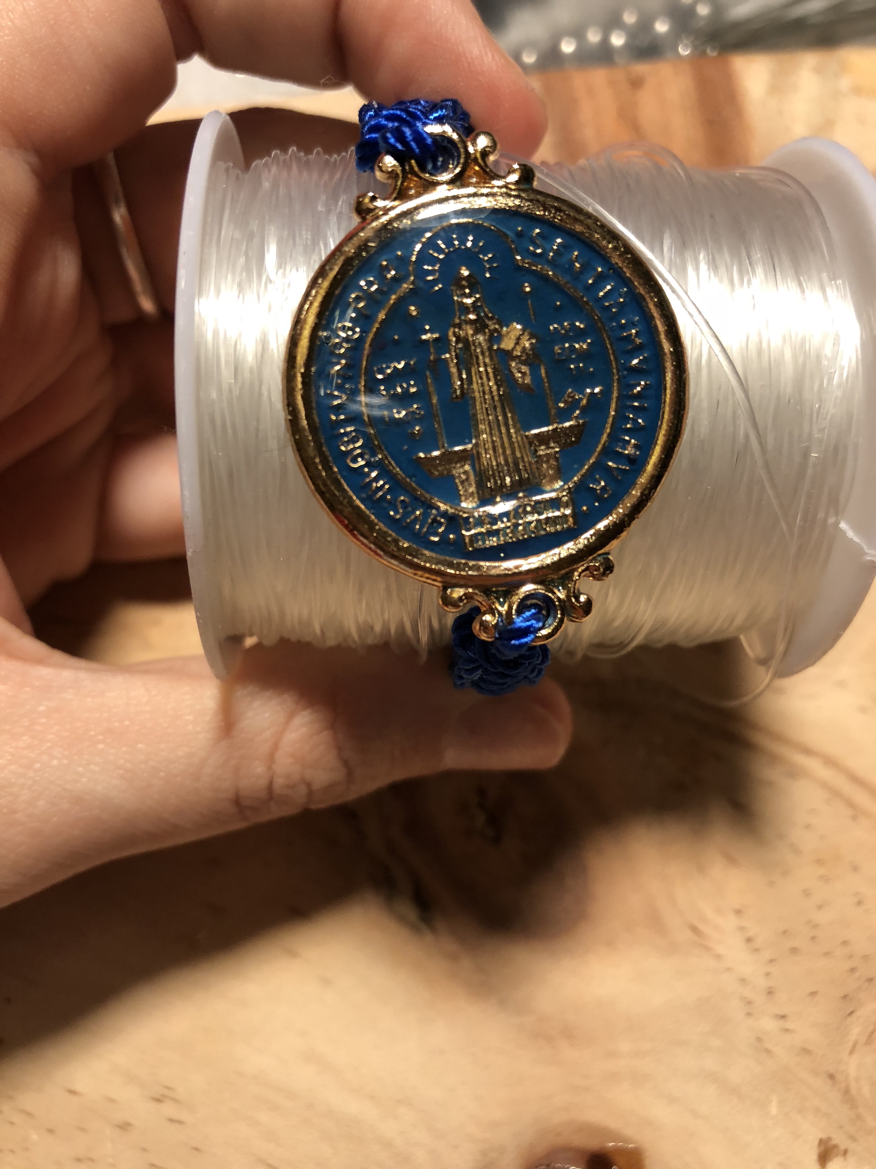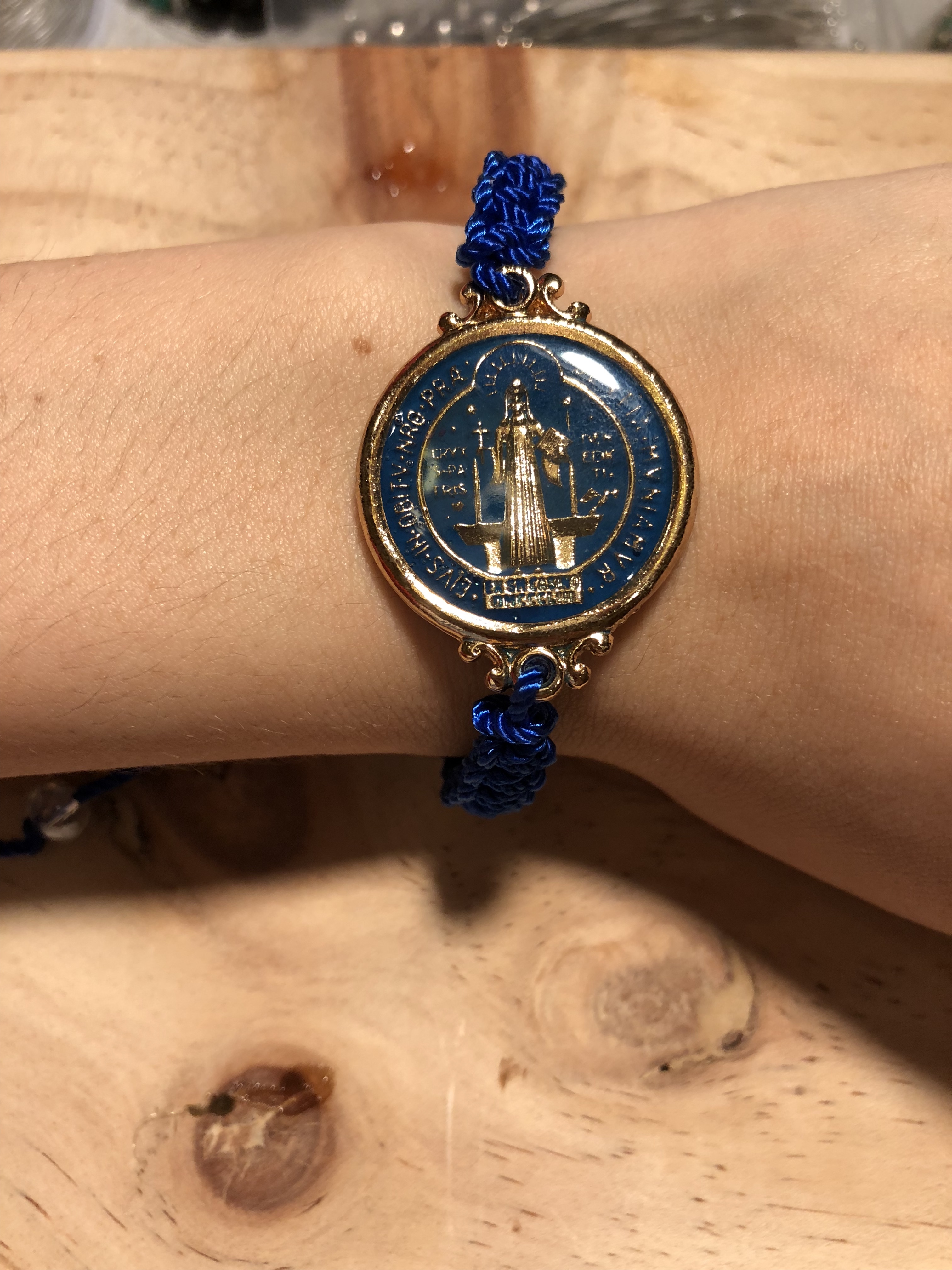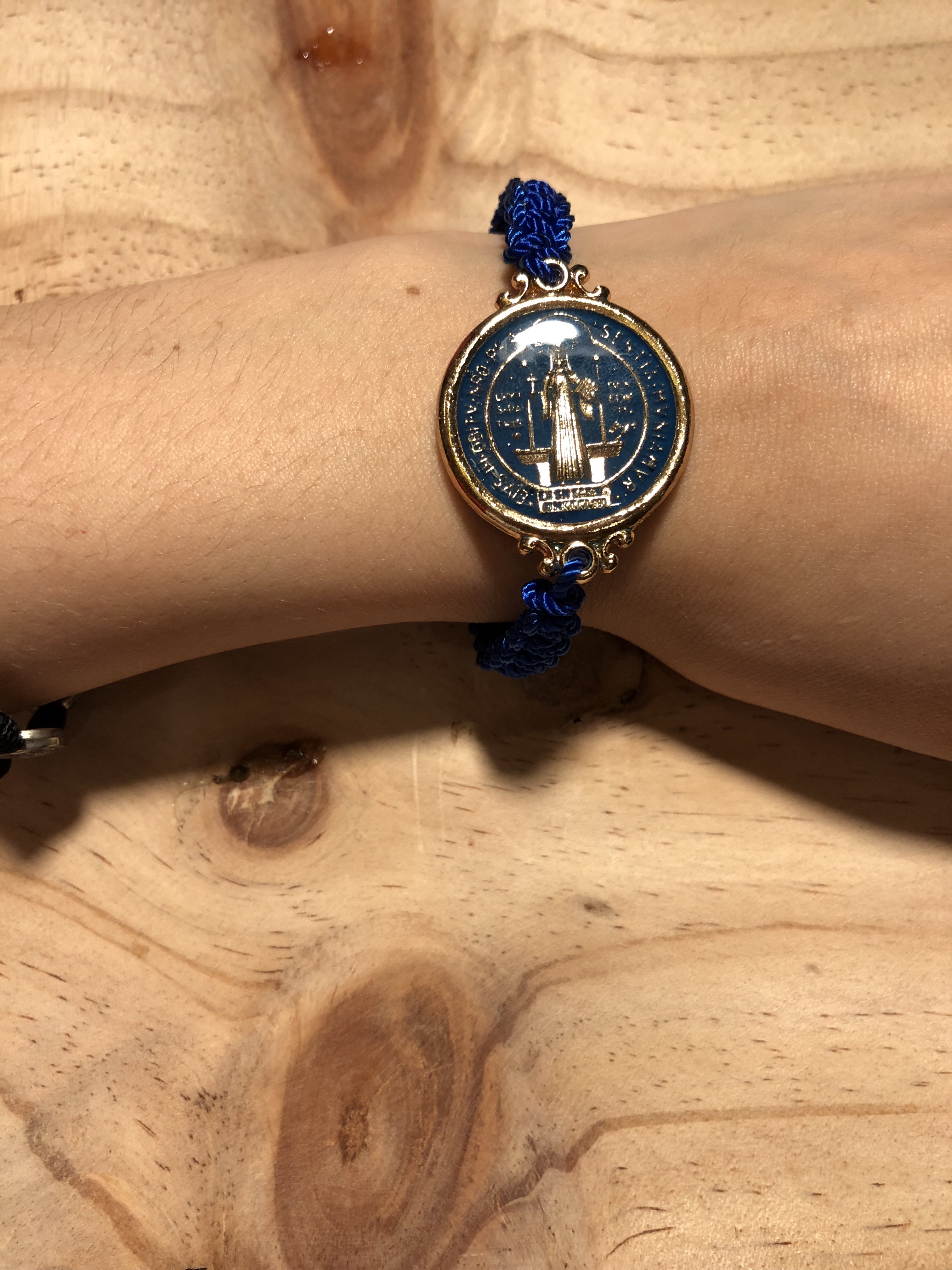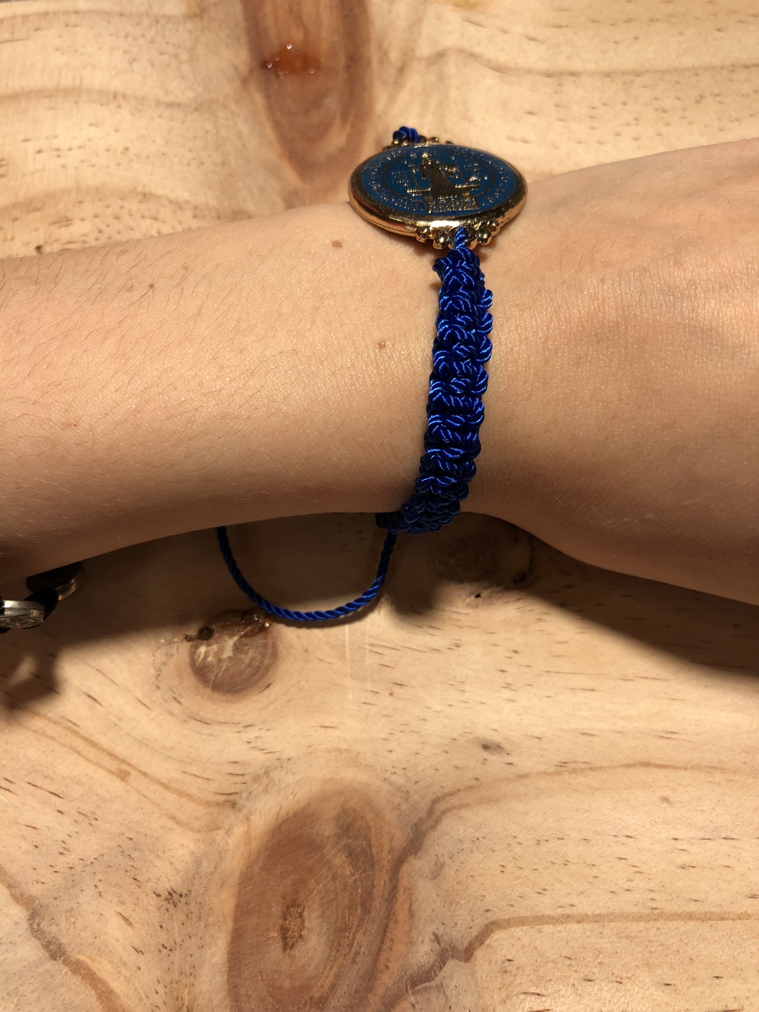 This bracelet is handmade by myself. The large charm is blue and the cording is made in a royal blue. San Benito is known to be the saint of protection.