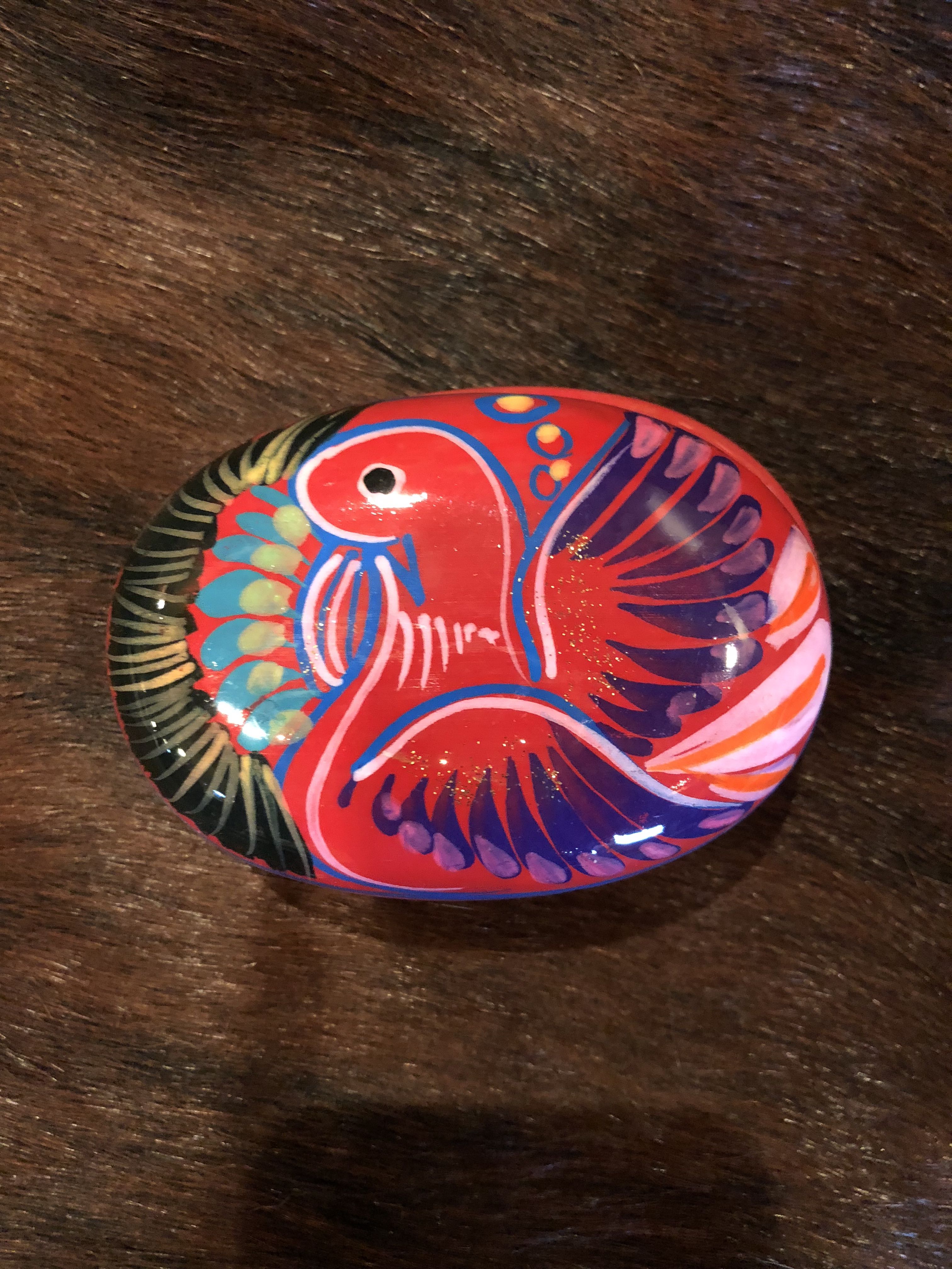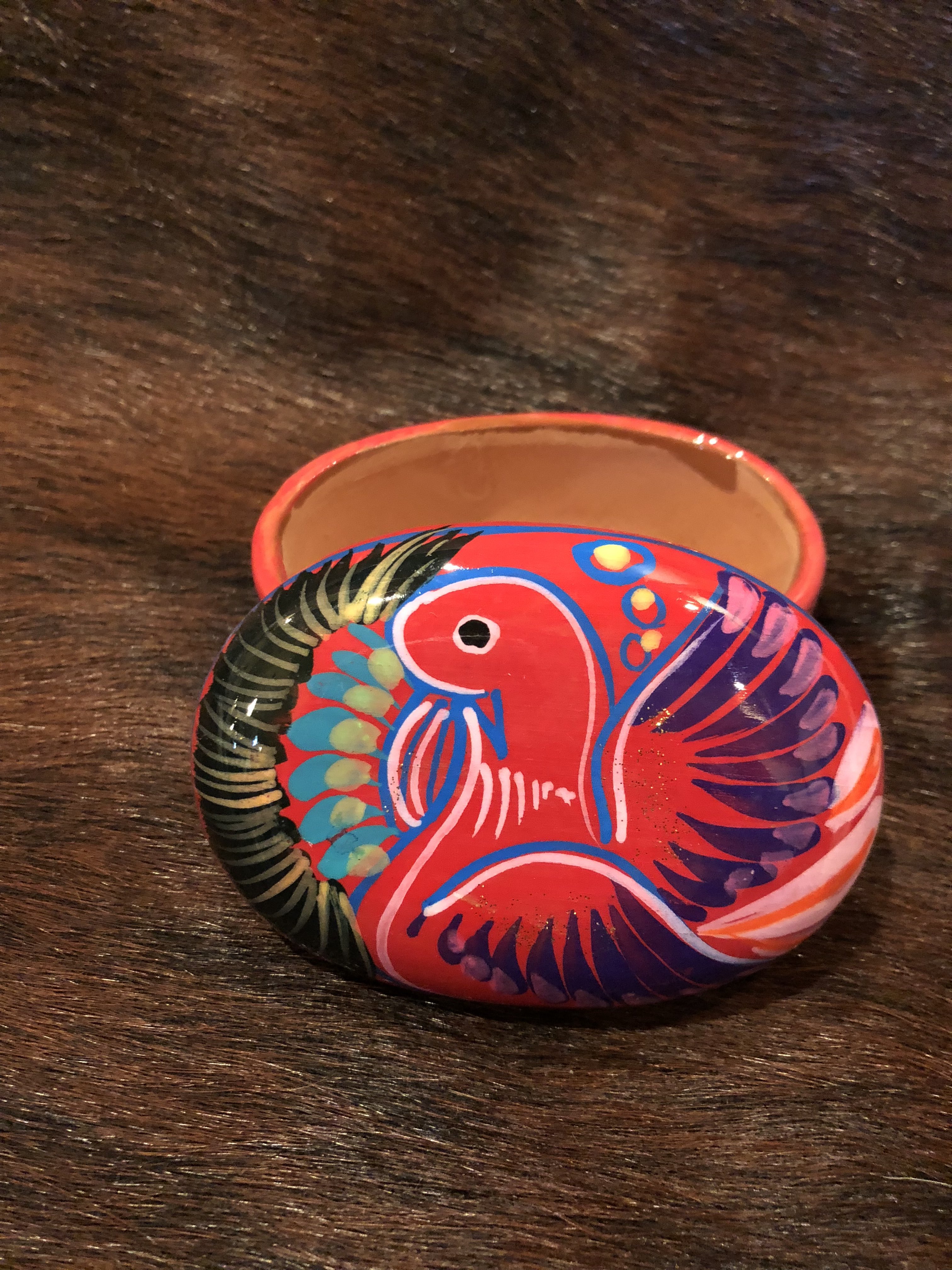 These are about 5" long ceramic boxes. They are each unique from each other. They are imported from Mexico and are very diverse from one another.