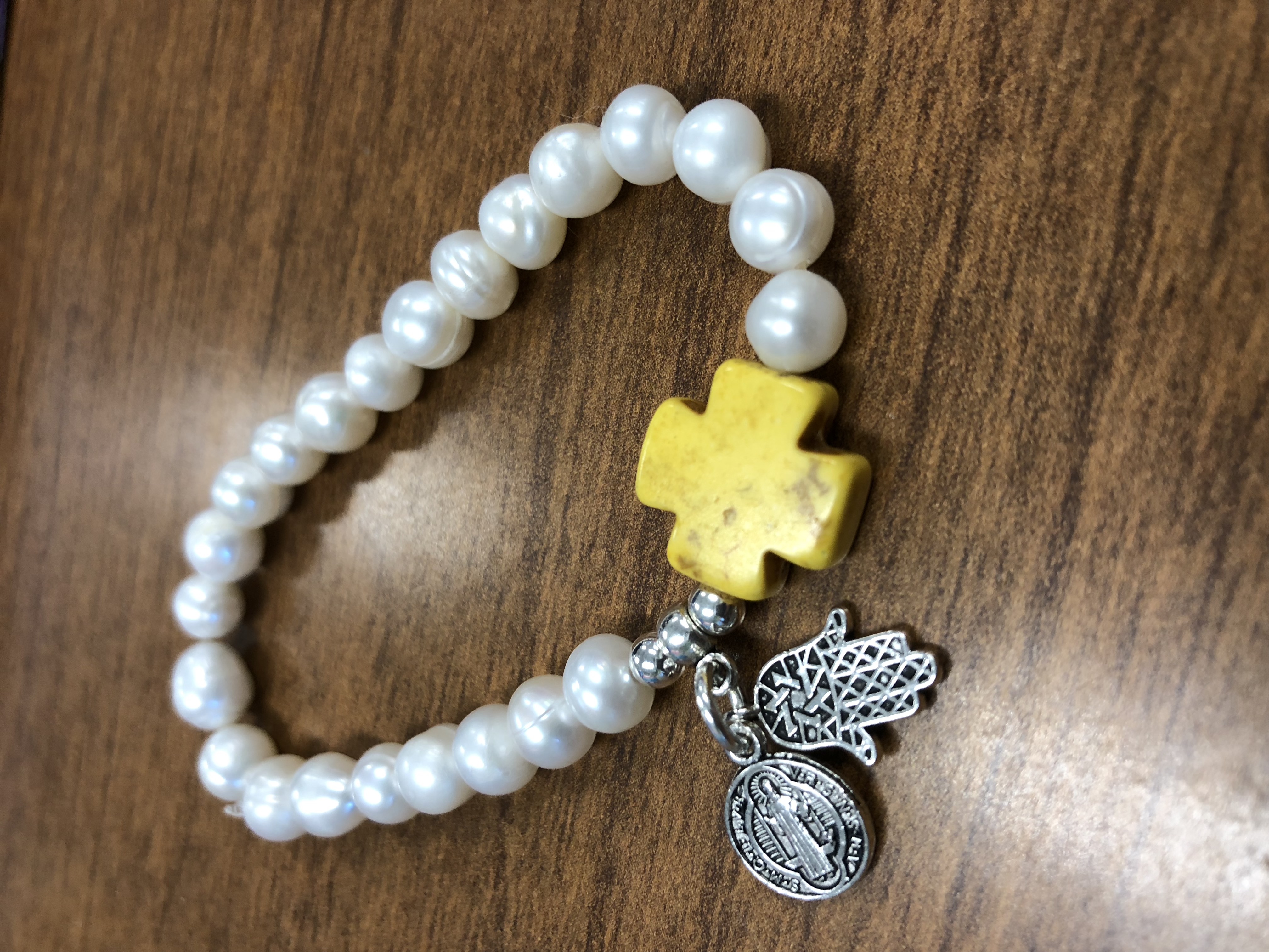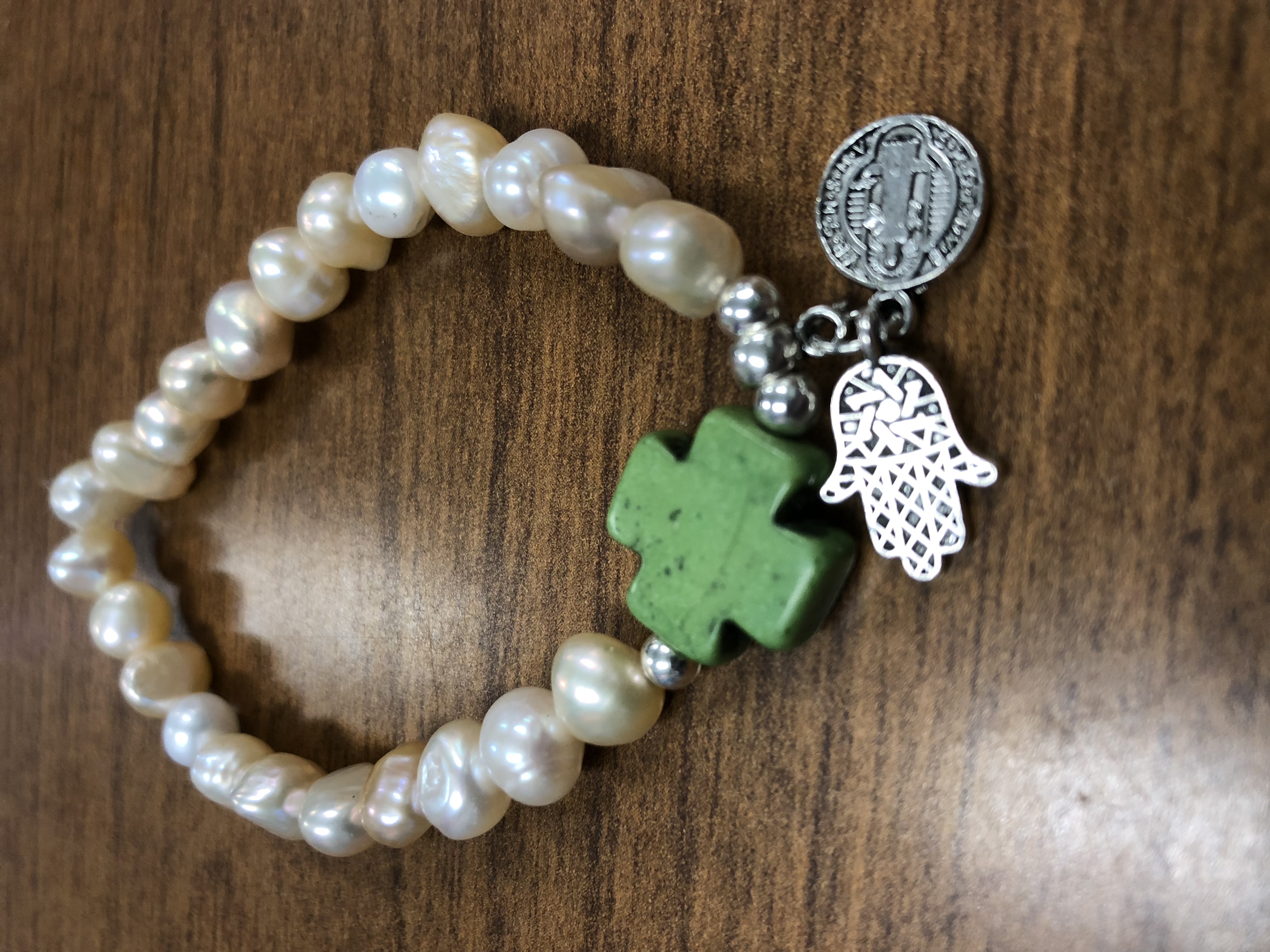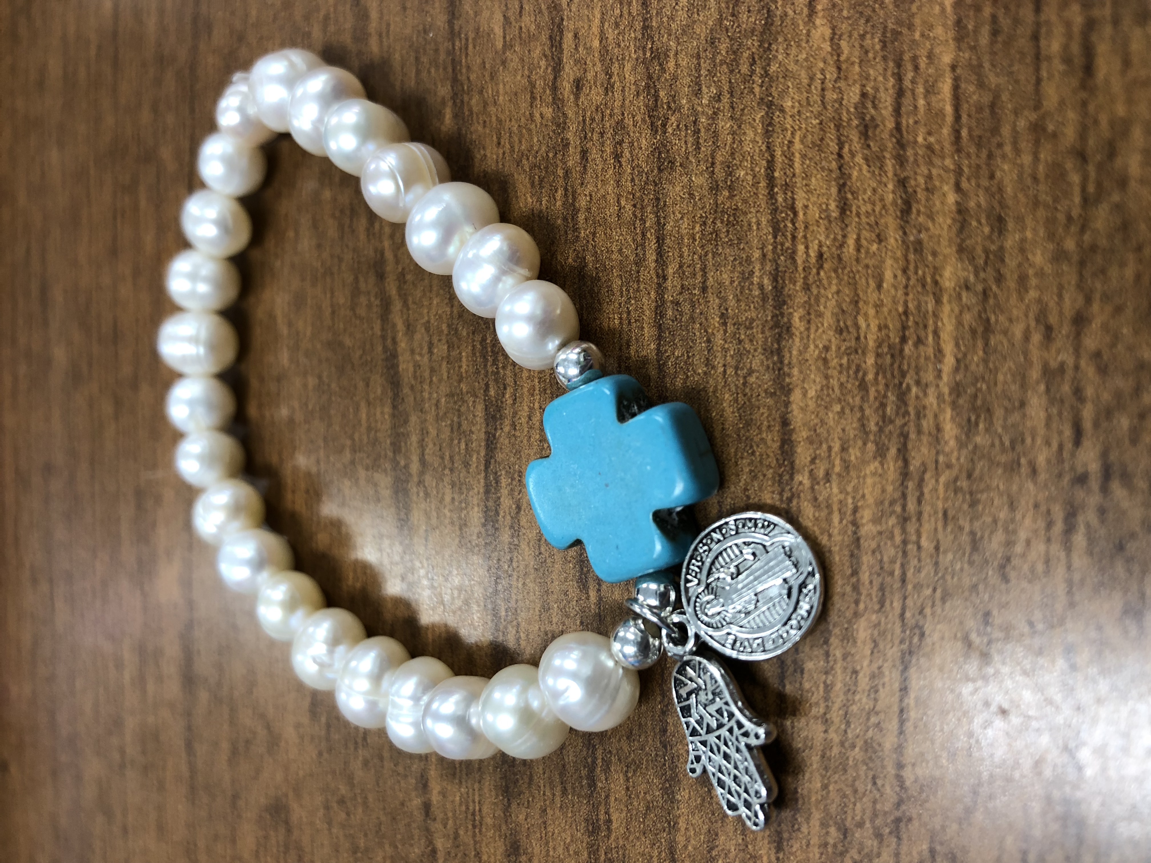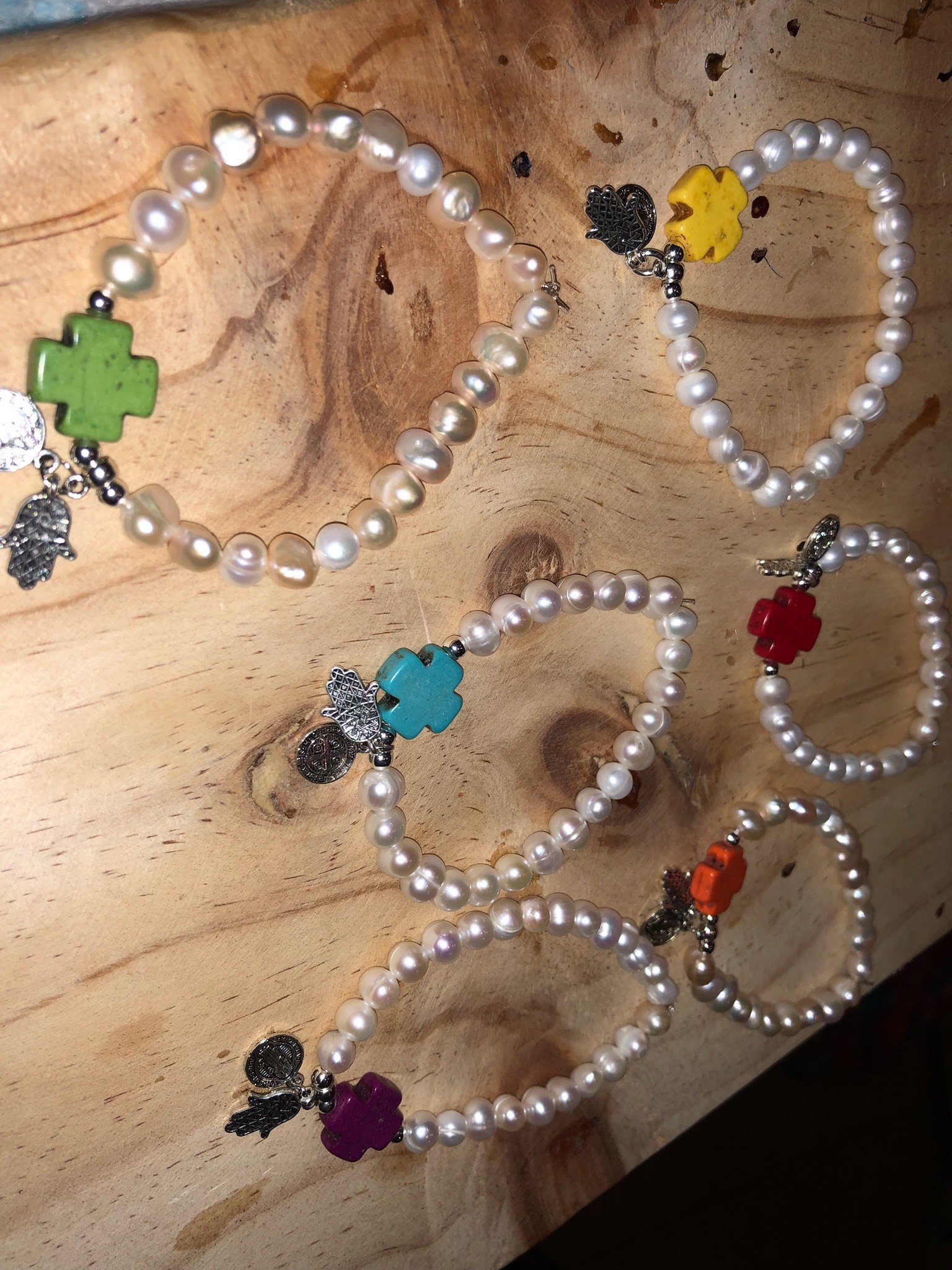 this bracelet is made with real pearls, multicolored cross, and 2 dangle silver charms that are san benito and the hamsa charm.