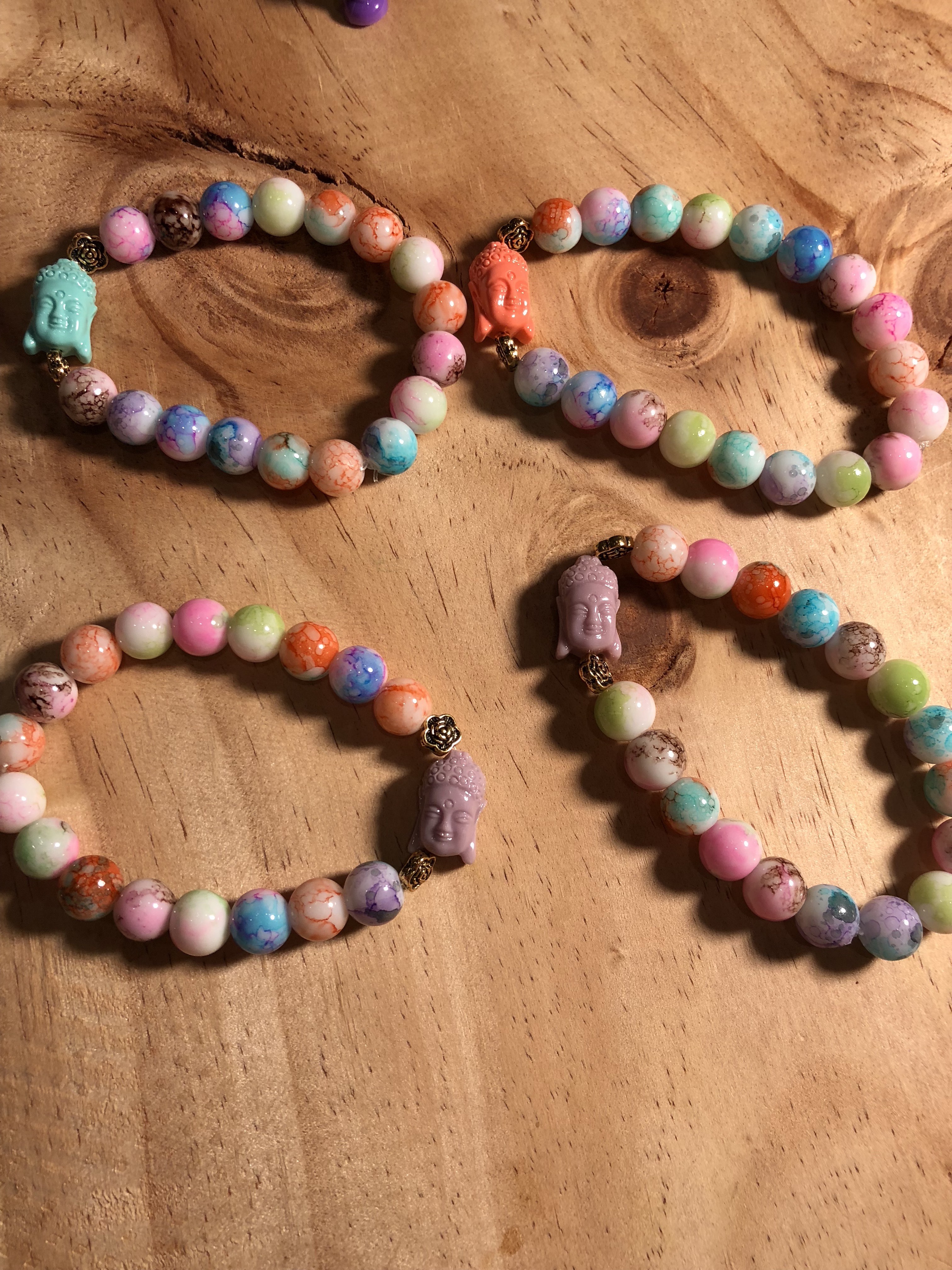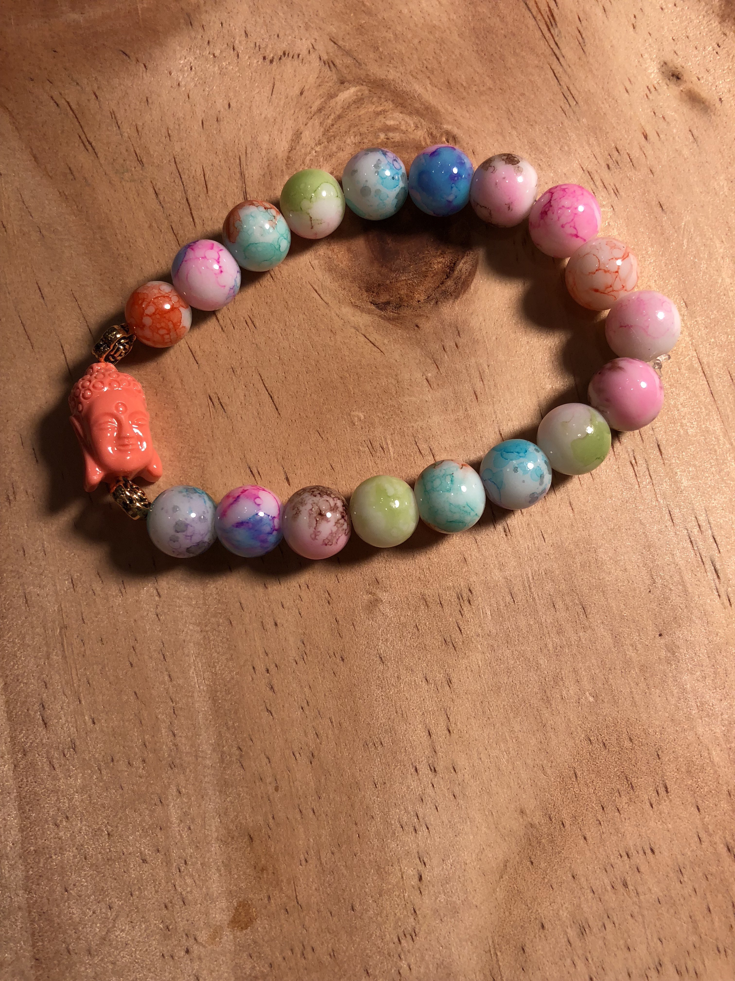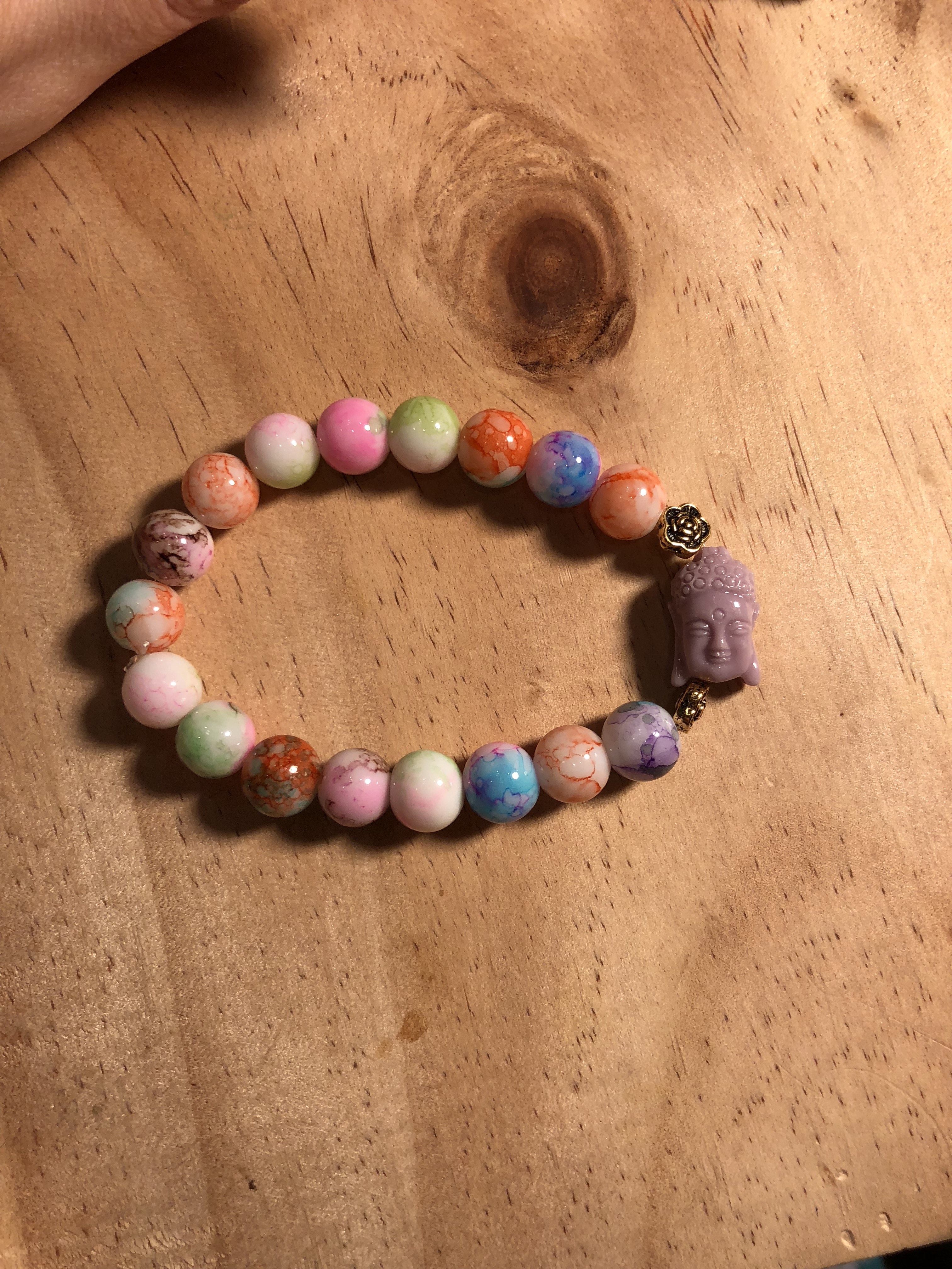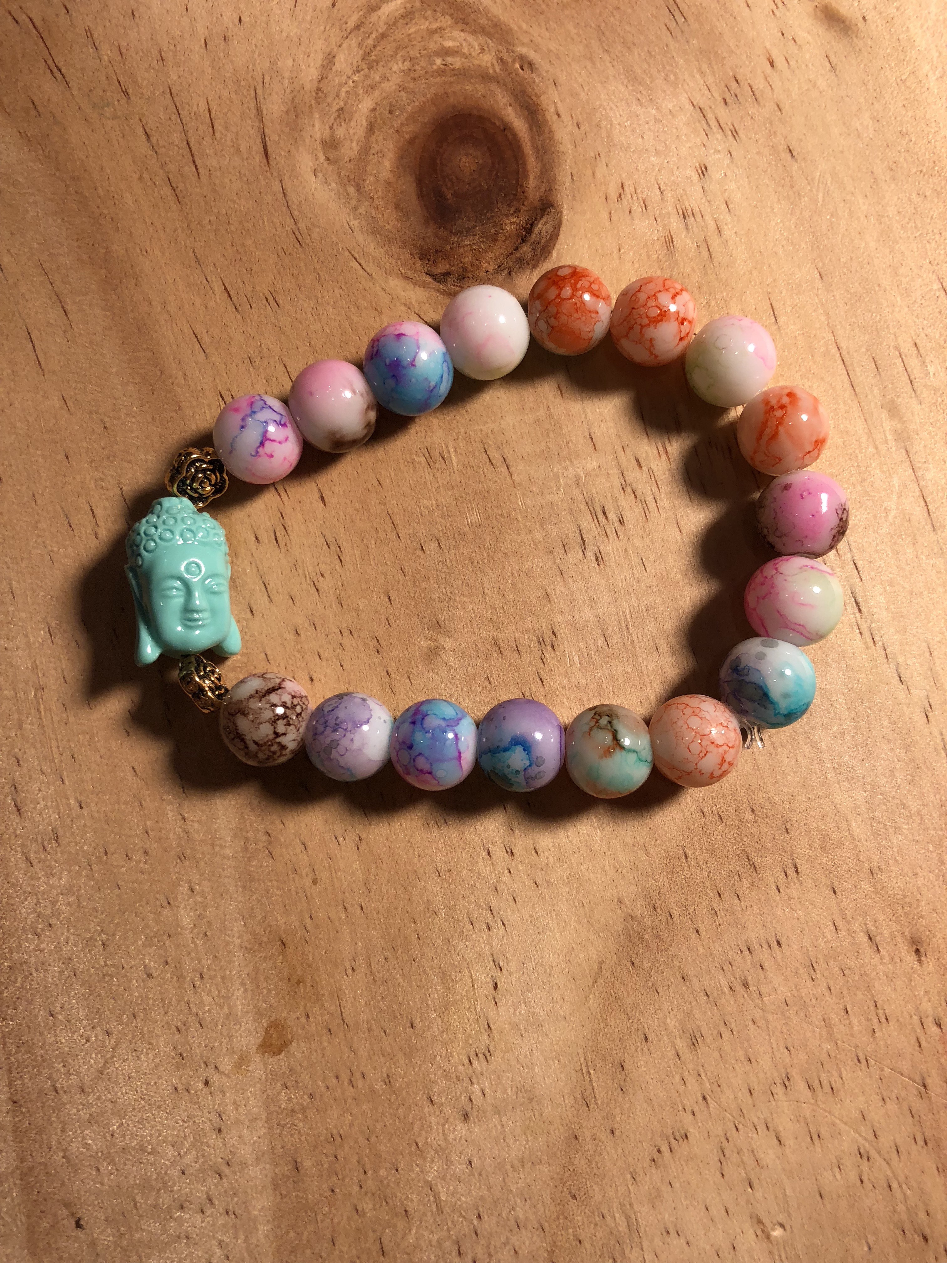 this bracelet is made out of multicolored agate beads with a pastel buddha in the center.