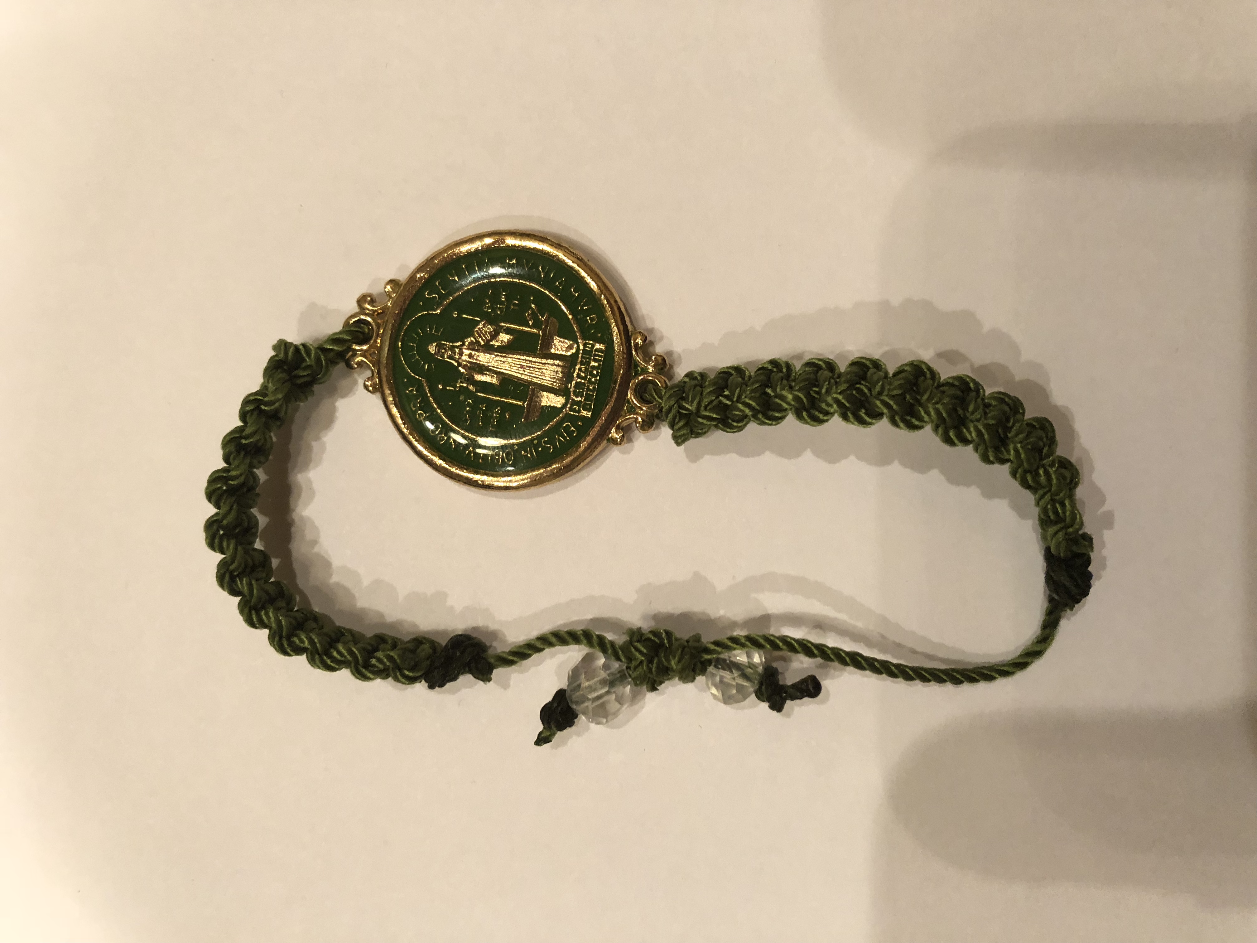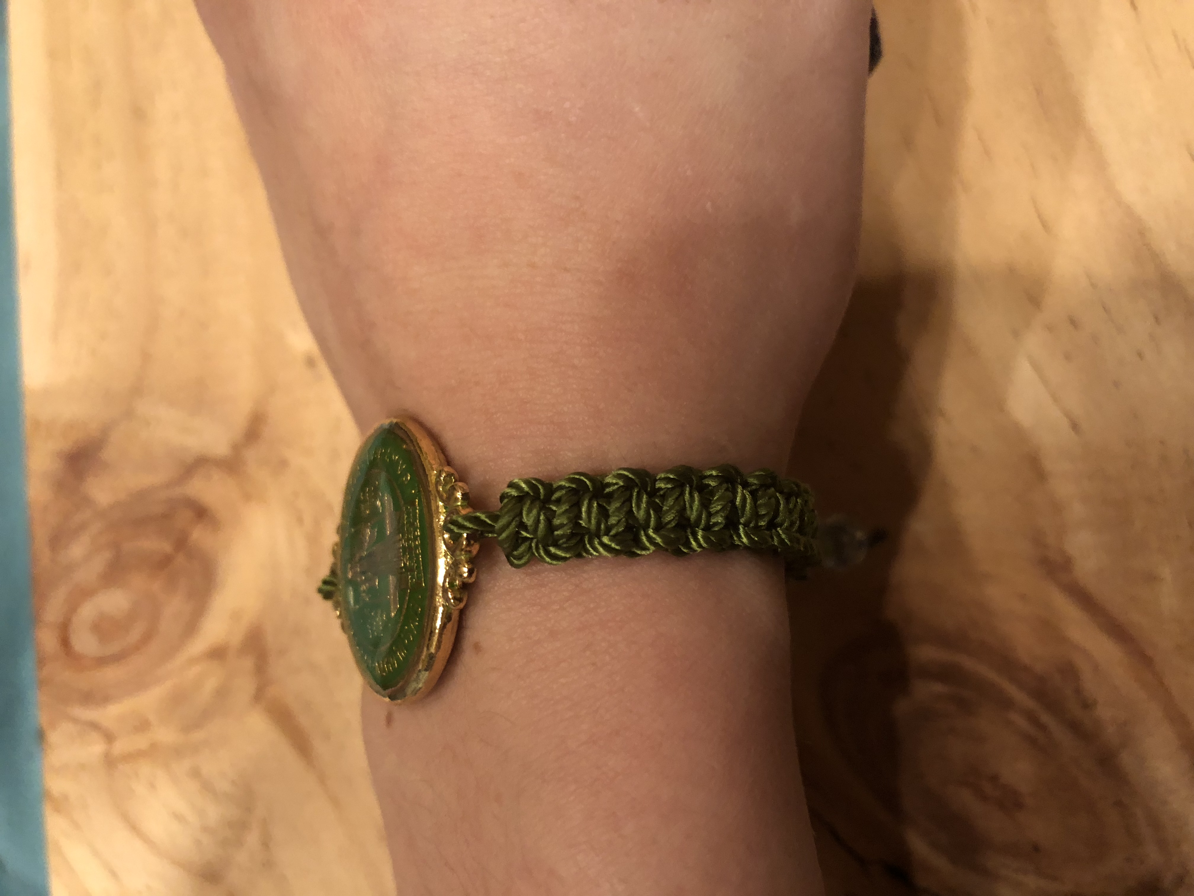 this is my large san benito charm in green. in the image the threading matches the charm. i do offer other color options if customer wants