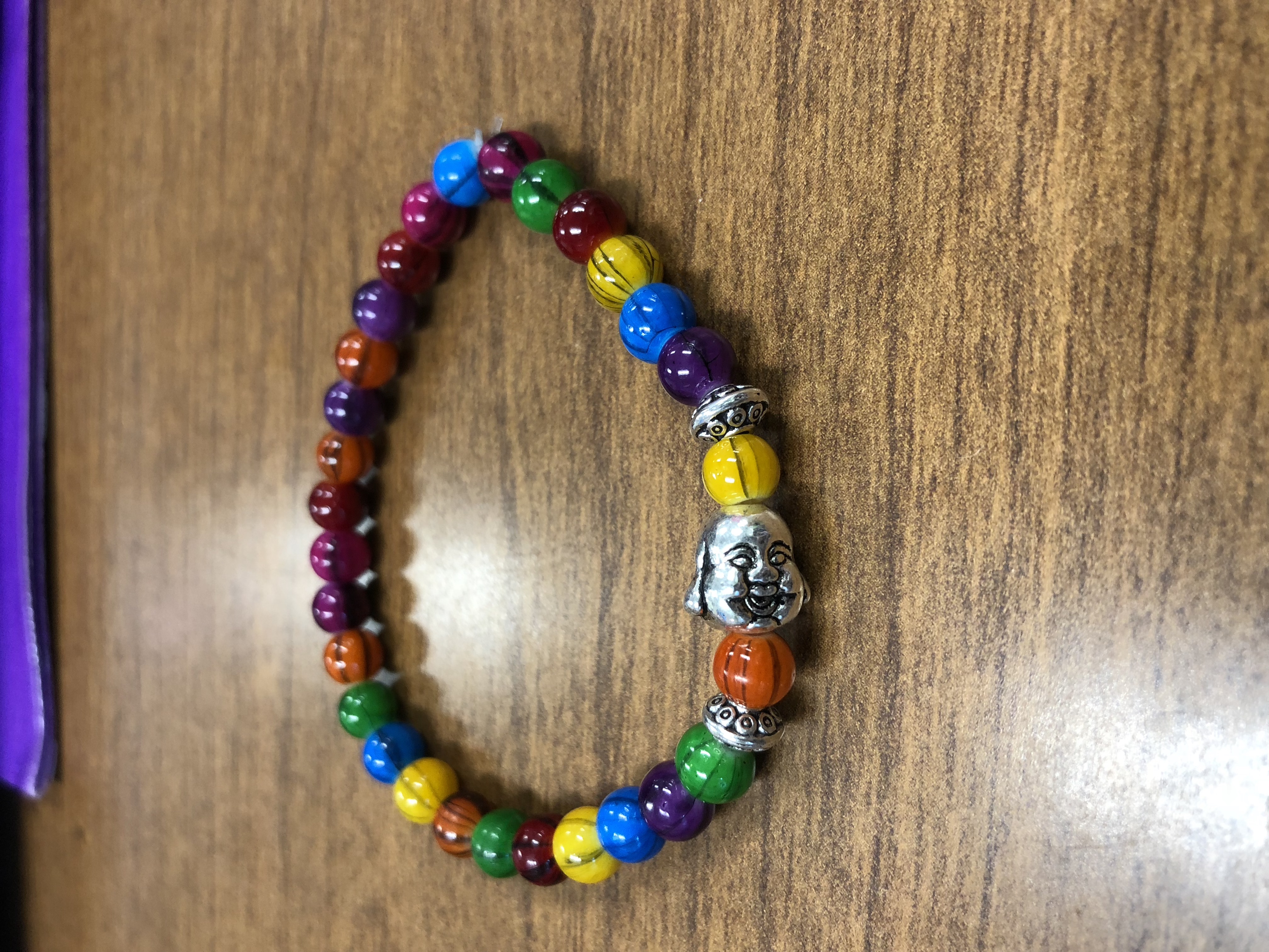 multicolored beads are what surround with silver buddha. this is a one of a kind handmade piece by myself.
