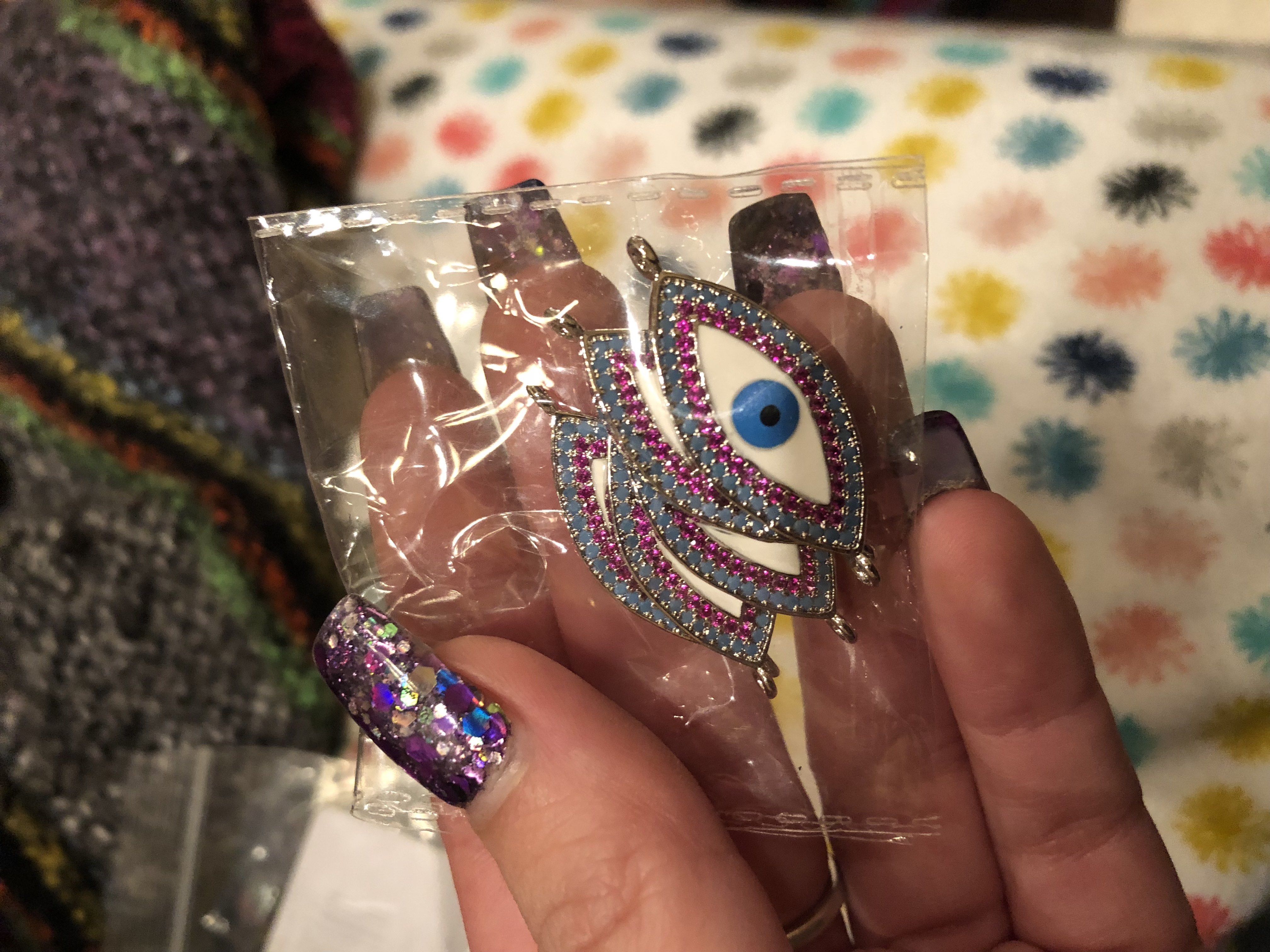 This charm is a large size ojo (evil eye). It is silver, pink, and turquoise. In addition to the wonderful color variations, it also has beautiful stones to make it shine. Normally we would use black threading but of course, we are always taking in custom orders if the material is in stock.