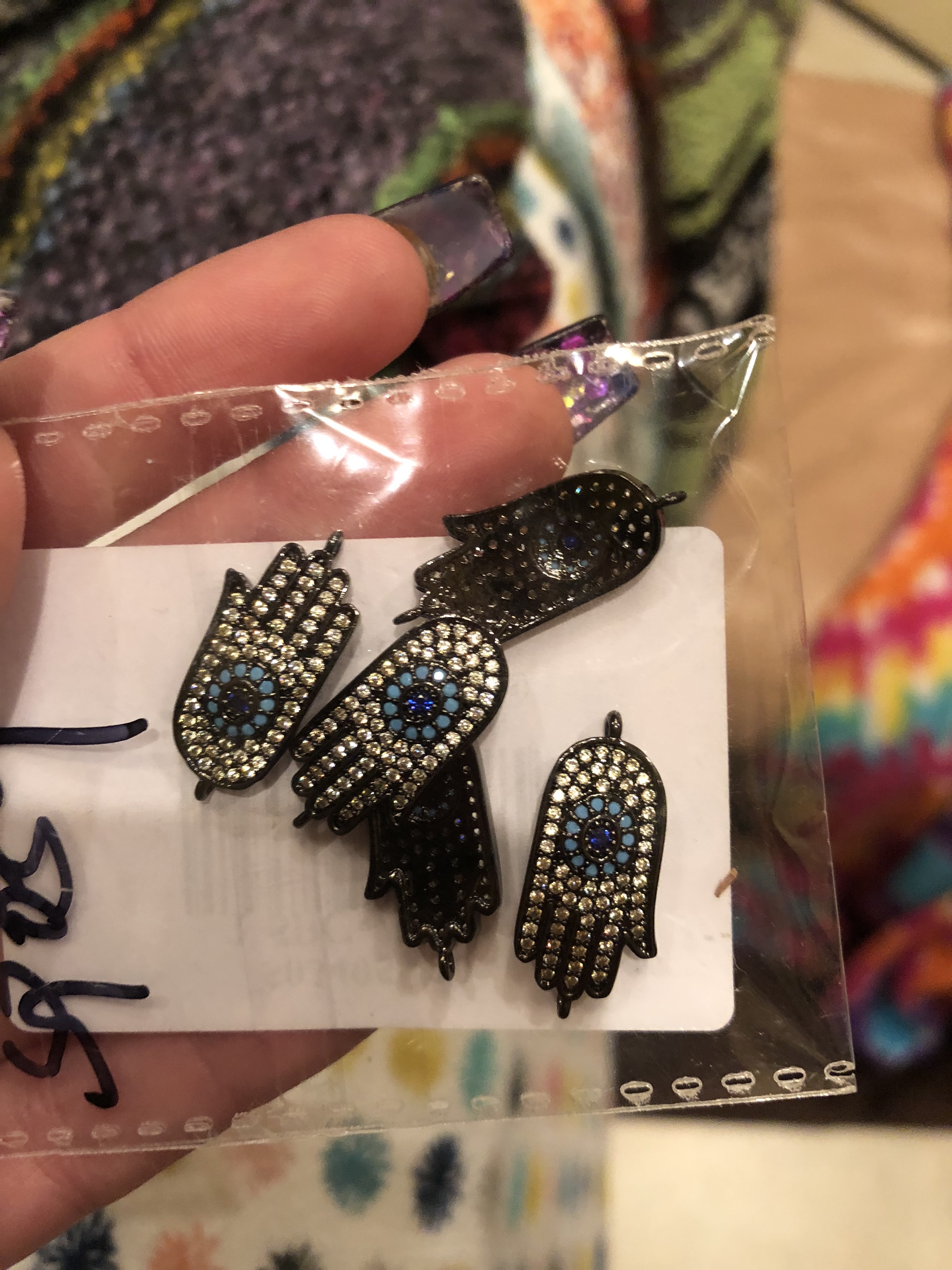 This charm is a hamsa hand and is black. It is embellished with CZ throughout the whole harm. Normally we would use black threading but of course, we are always taking in custom orders if the material is in stock.