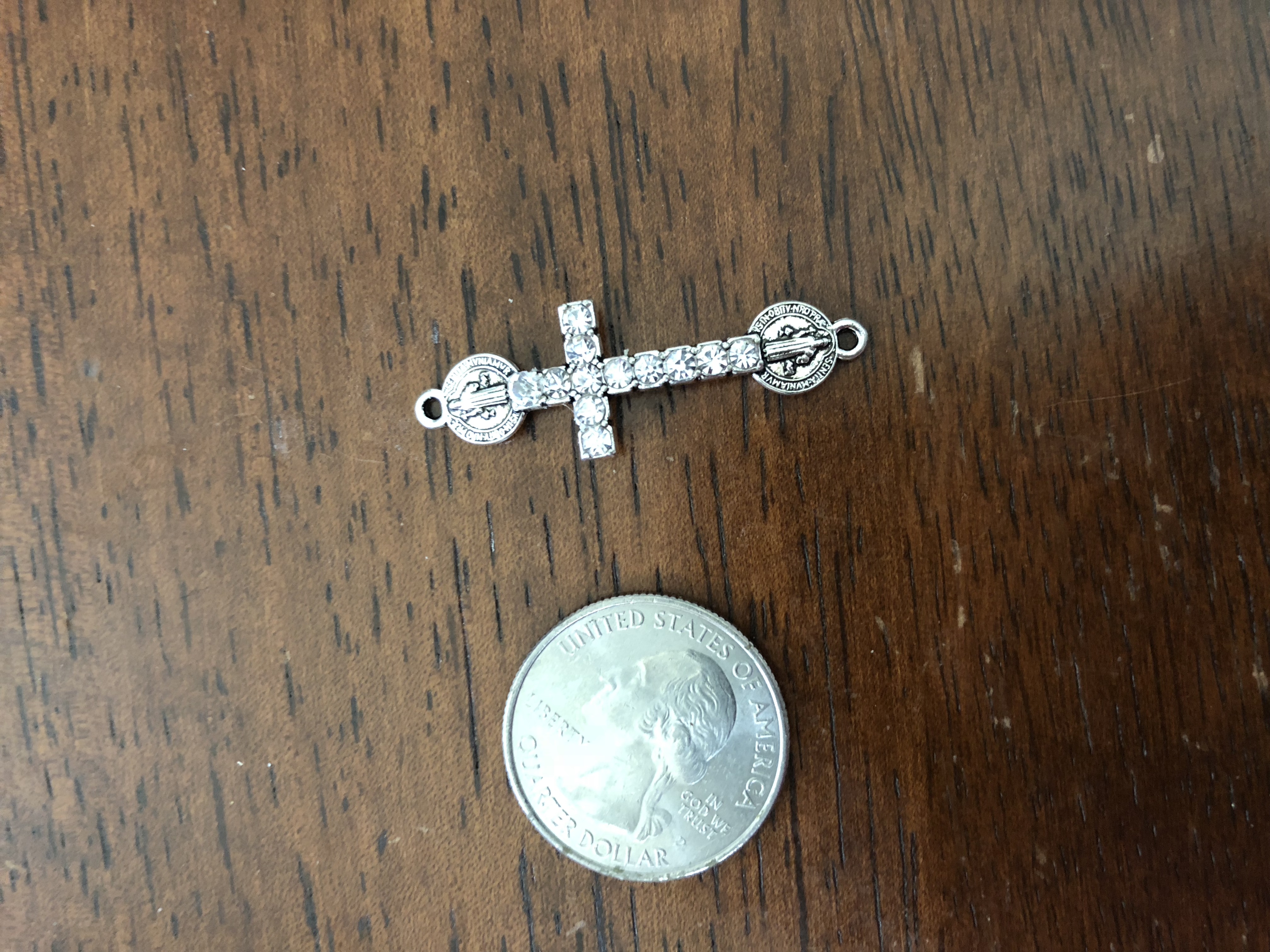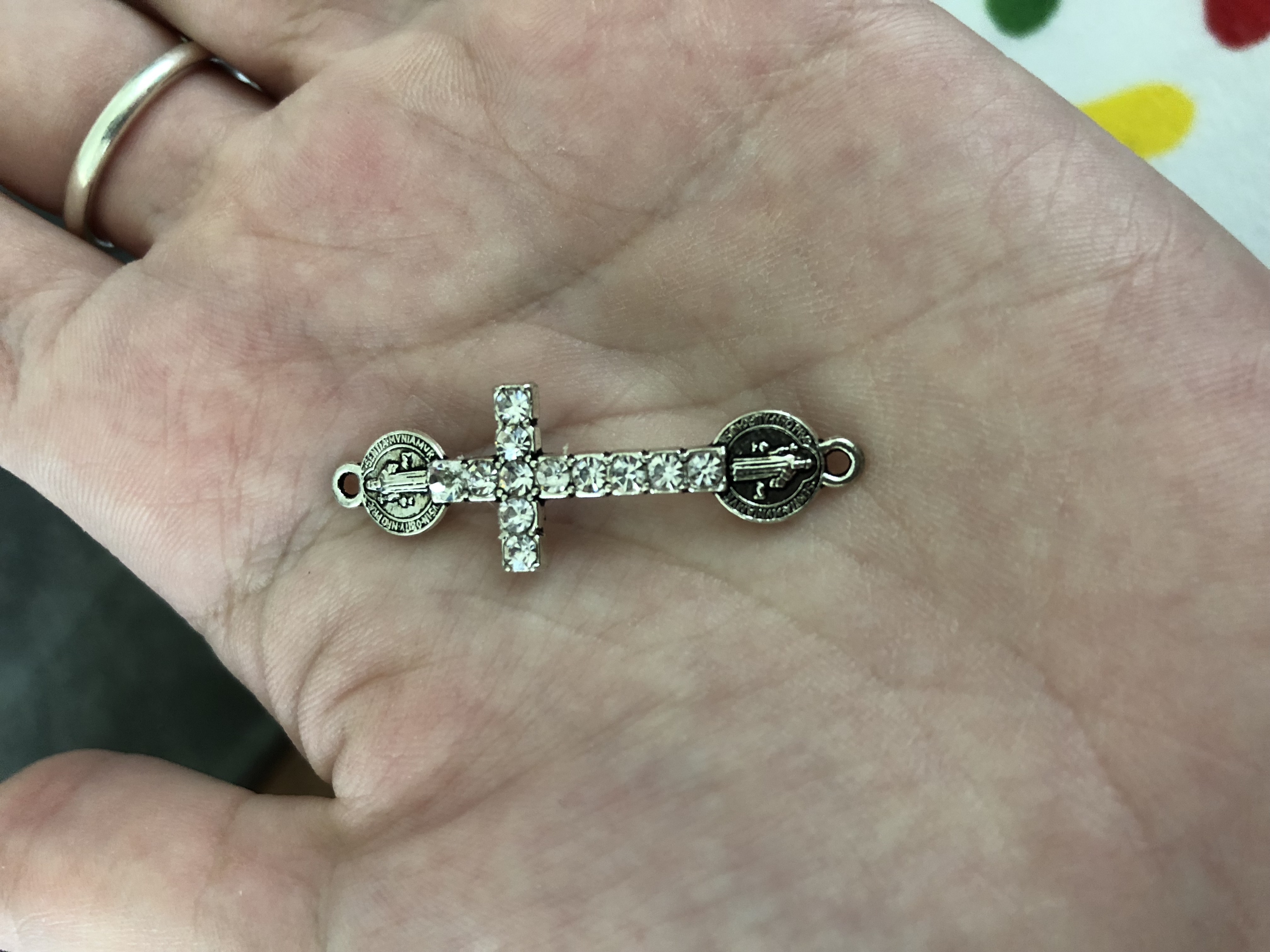 bedazzled cross with two small san Benitos at the end. This can be threaded with any of our threads available. make sure to put desired color in the comment when checking out.