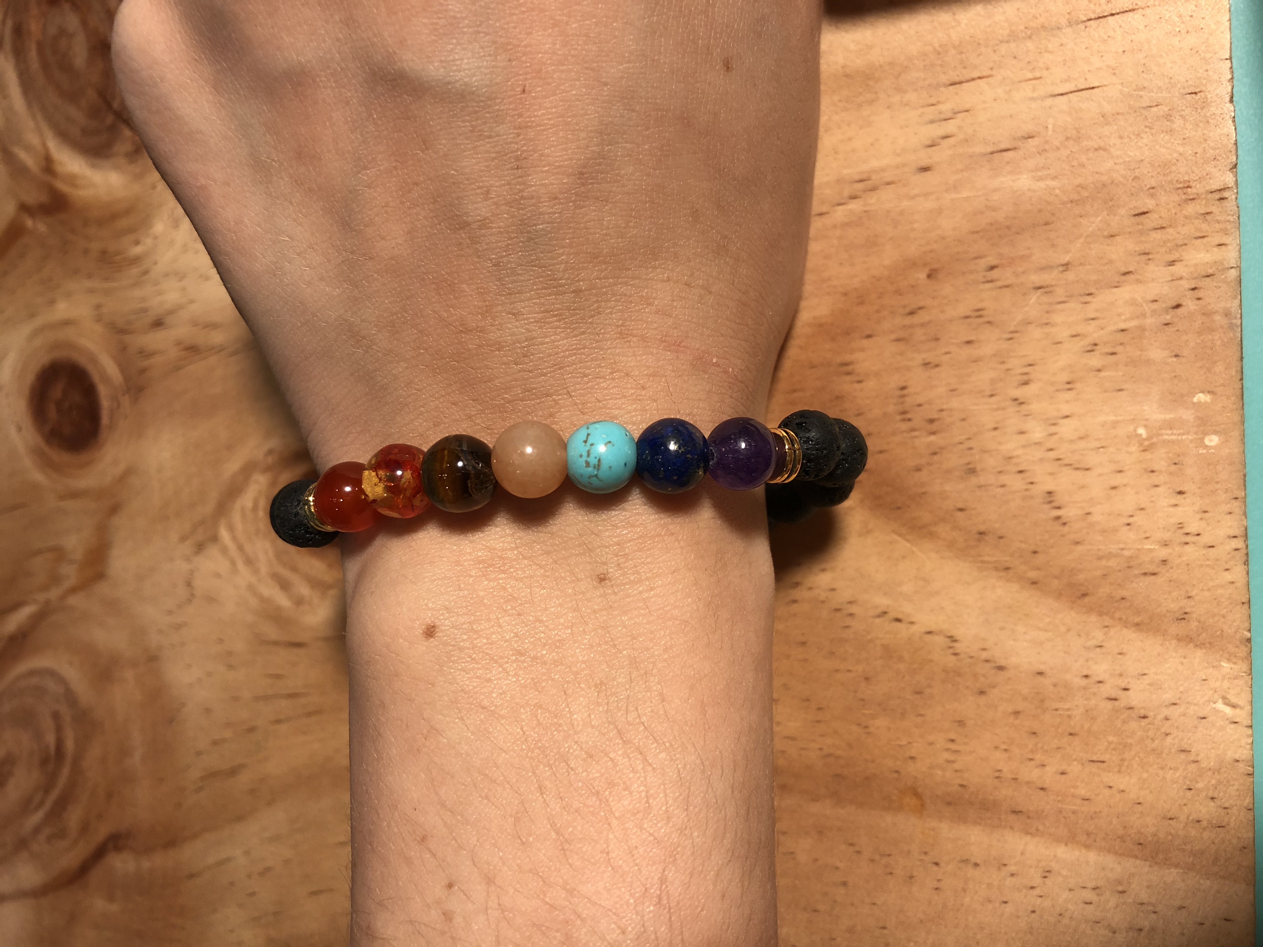 These are our handmade Chakra bracelets made with black lava beads. Each color represents a different aspect of the human body.