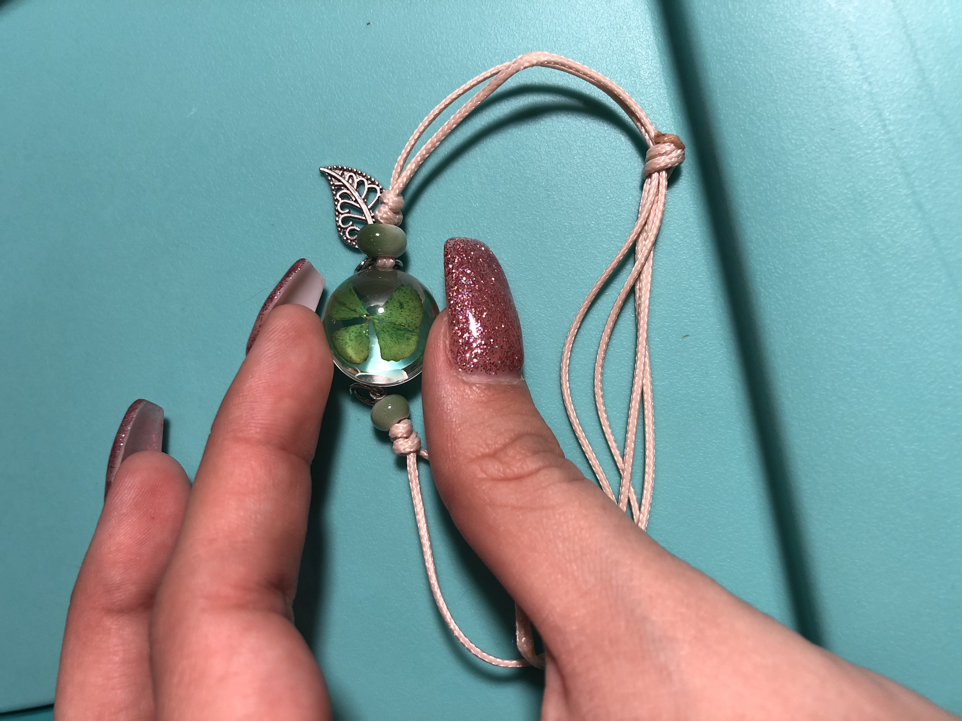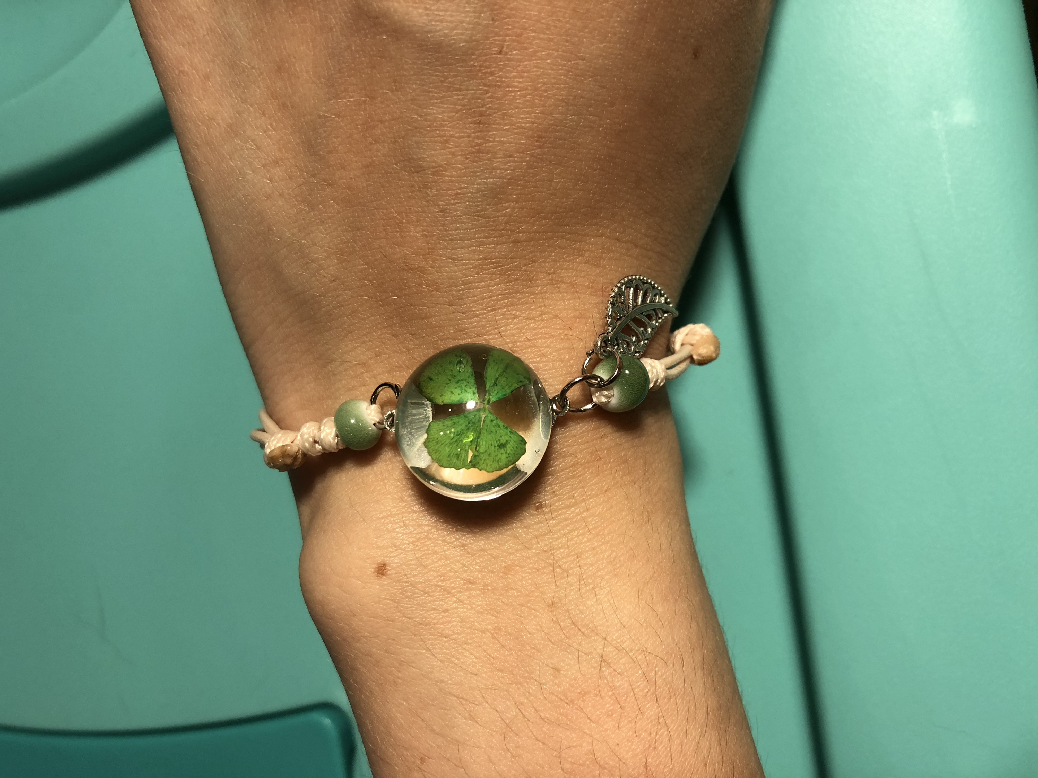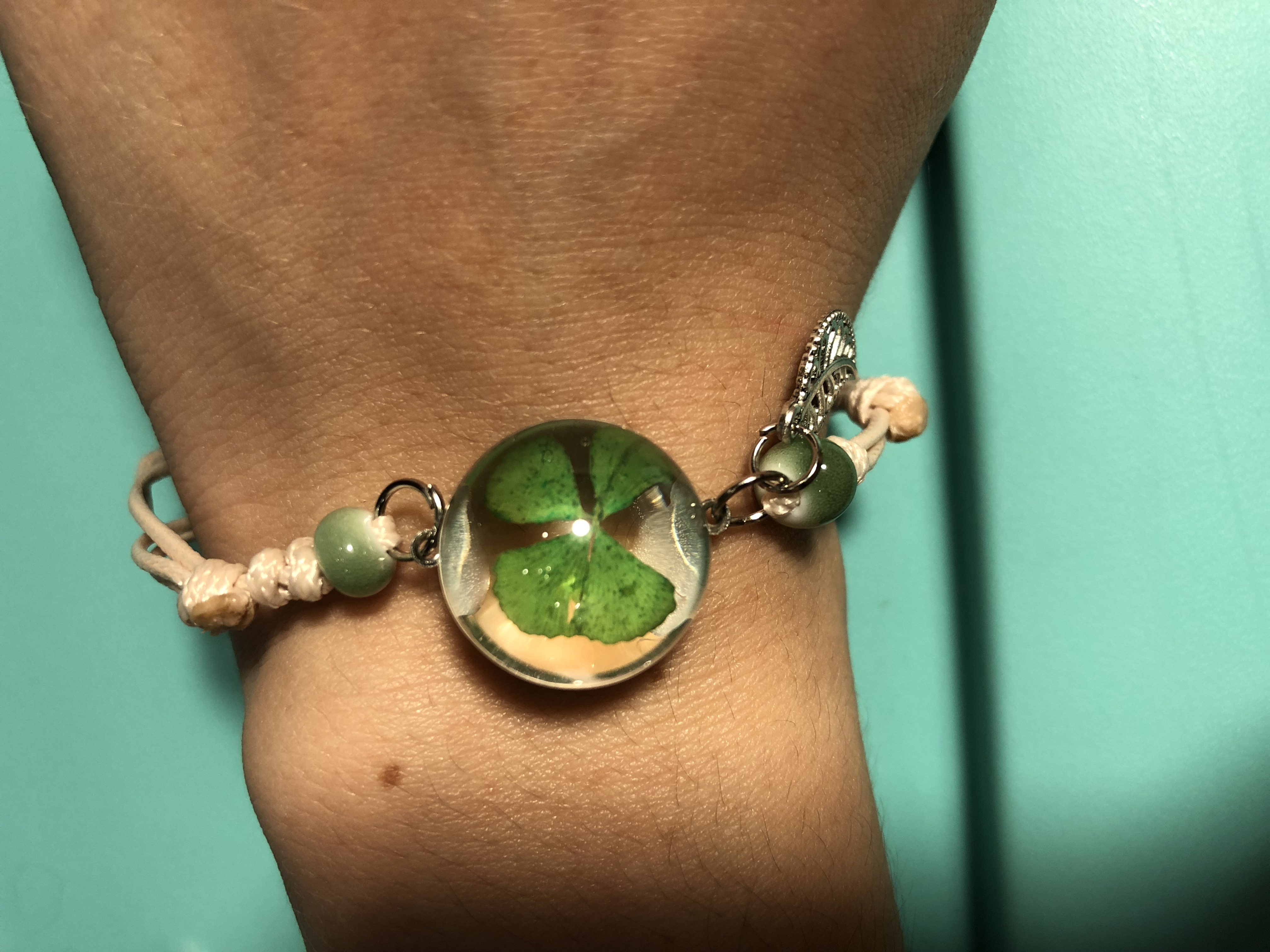 This is our handmade resin clover charm. It is embellished with a leaf silver charm and has the hemp waxing cord. It is adjustable so it can fit all wrist sizes.