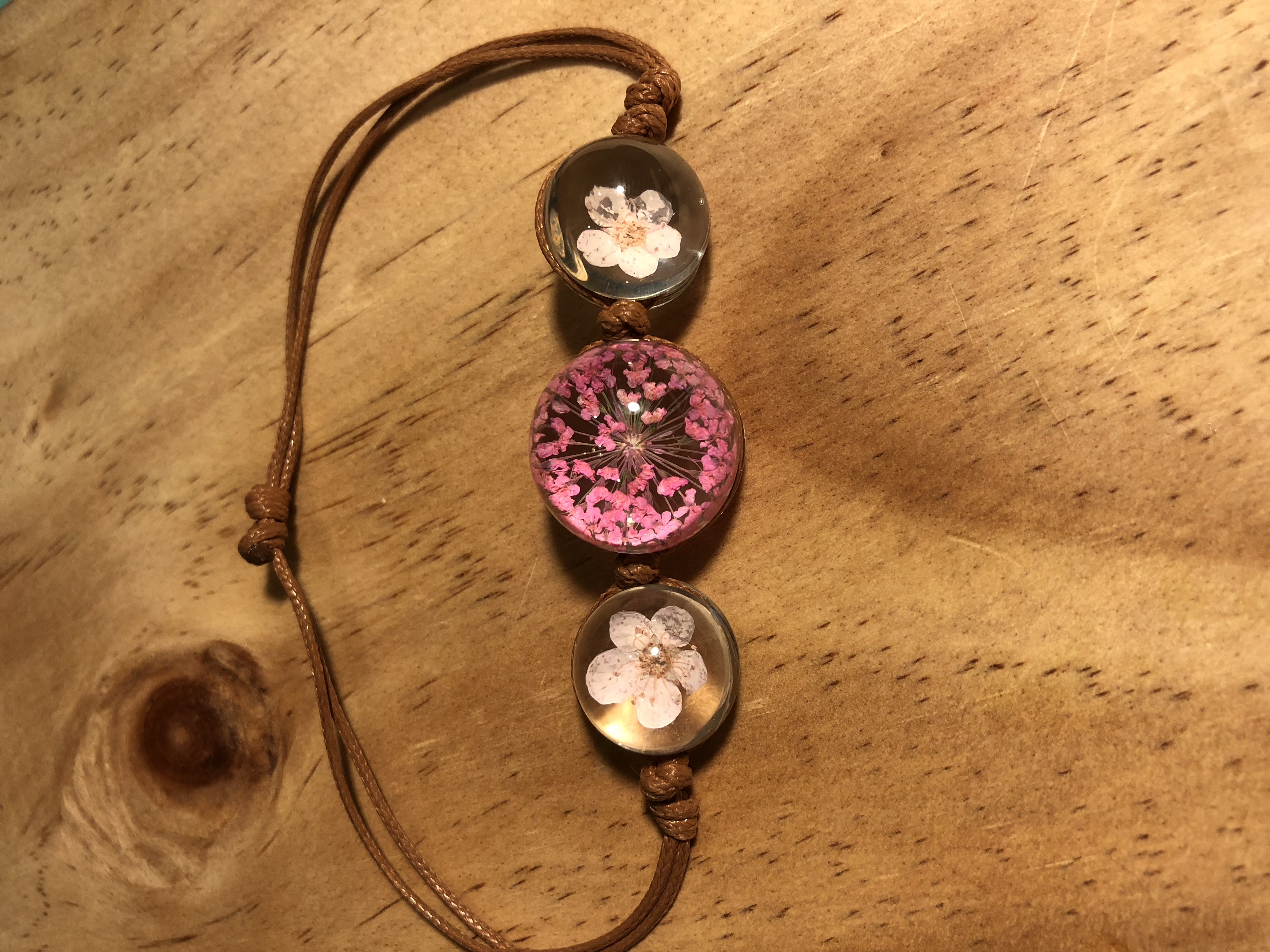 These are handmade blue flower resin beaded bracelet. It is made with brown adjustable leather threading. It has three beads. One large pink bead in the center and two medium size beads on the side.
