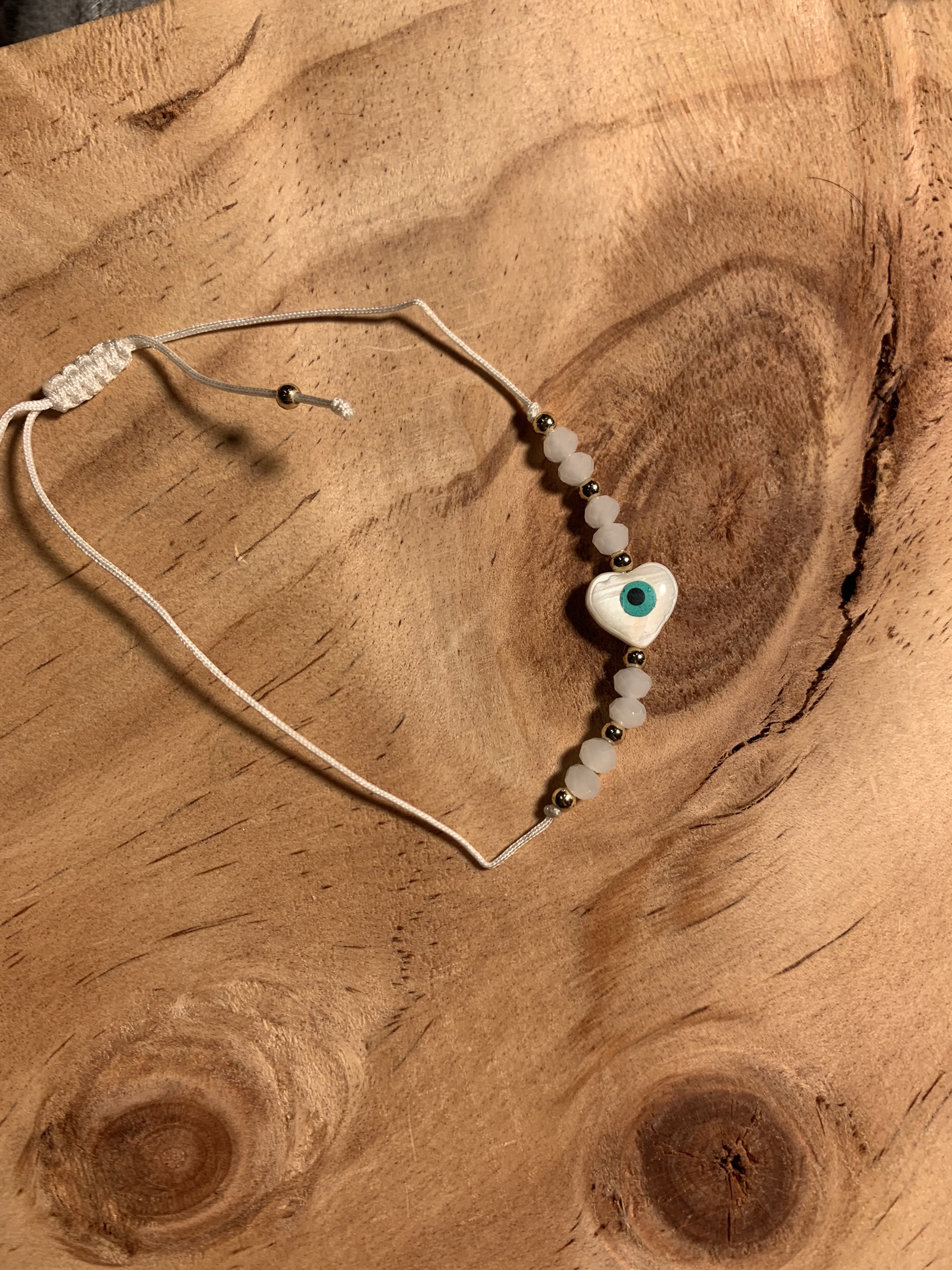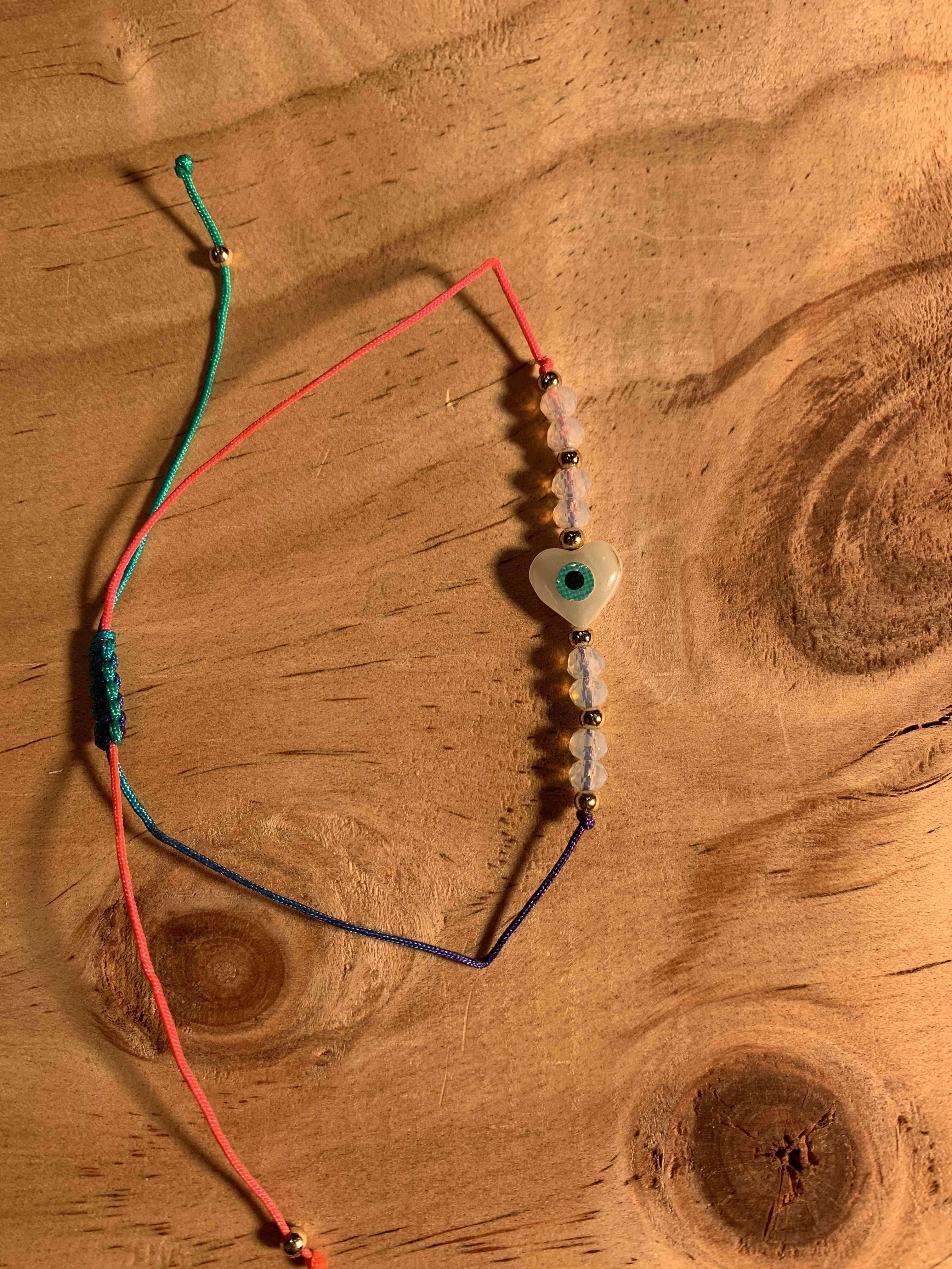 This is an adjustable threaded bracelet. It has a center shell heart ojo charm and is then surrounded with beads.