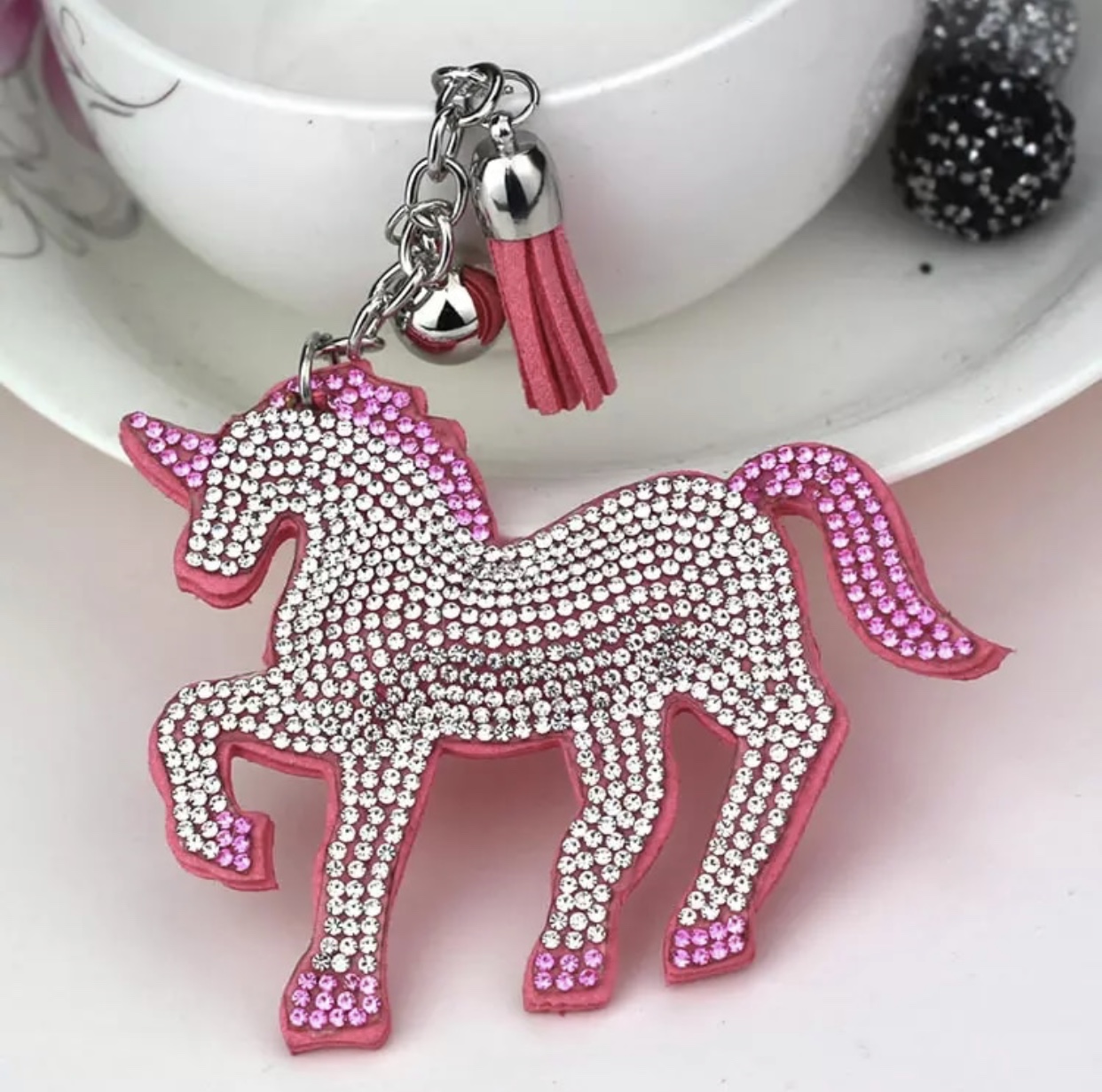 This unicorn is pink with white rhinestones. She is the perfect dash of glitz and glam for any set of keys.